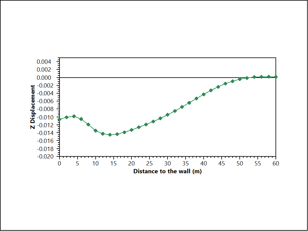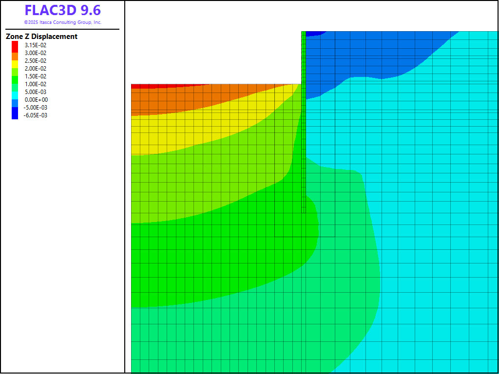 The diaphragm wall is modeled using zones (Young’s modulus = 30 GPa, Poisson’s ratio = 0.15, thickness = 0.8 m).