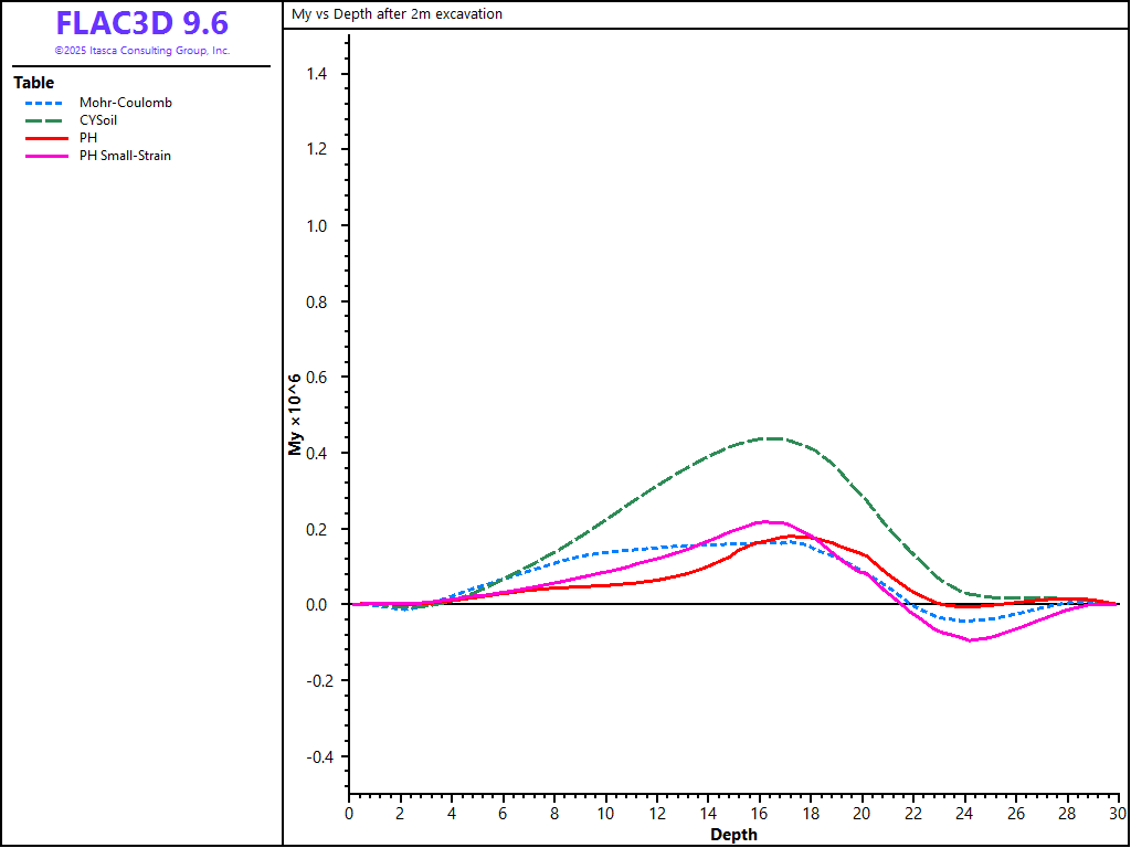 The deformation of the soils during excavation is of particular interest in this example, specifically the heave at the bottom of the excavation and the surface settlement adjacent to the excavation wall. Two different material models, the Mohr-Coulomb model and the CYSoil model, are used to illustrate the effect of the material model on the calculated deformational response of the soil. It is noted that for uniform elastic properties, the linear elastic/perfectly plastic Mohr-Coulomb model may predict unrealistically large deformations in soils subjected to loading and unloading, such as heave induced at the bottom of excavations. A more realistic calculation may be obtained with the nonlinear elastic/plastic CYSoil model.