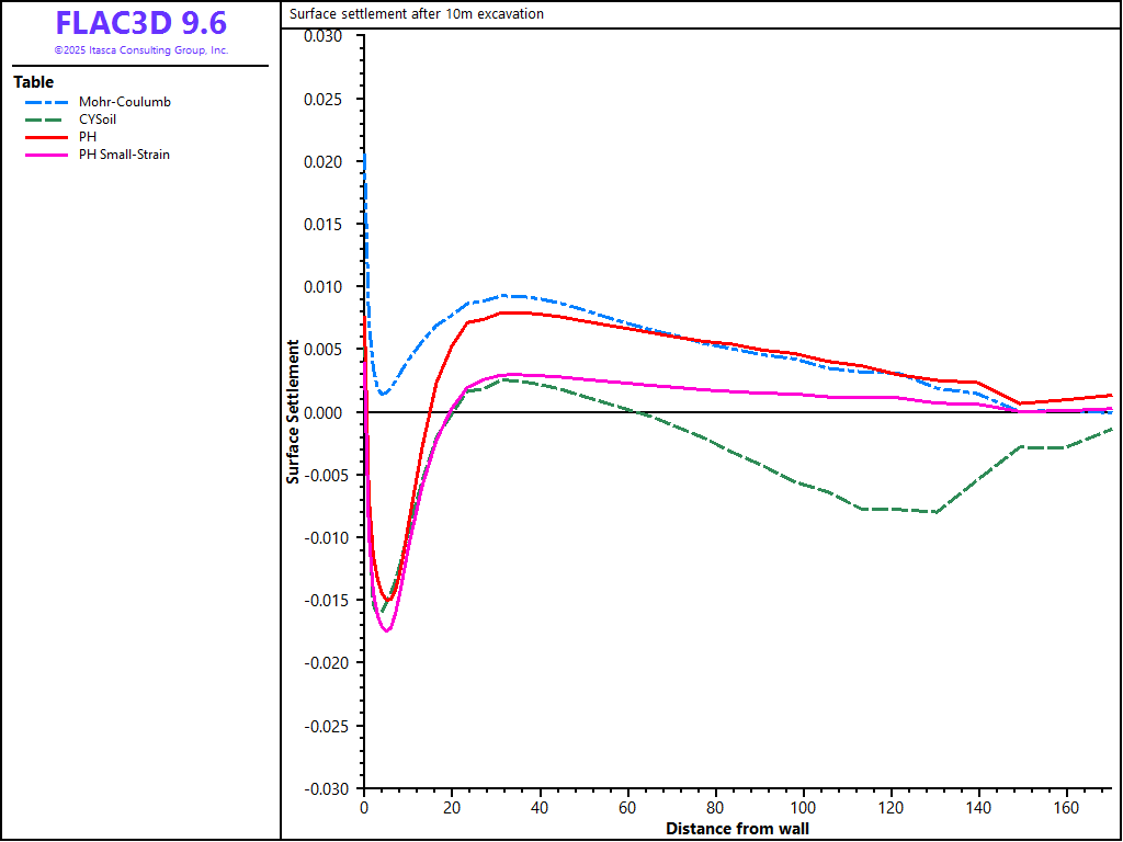 A braced excavation is constructed in saturated ground. The excavation is dewatered during construction and is supported by diaphragm walls that are braced at the top by horizontal struts. The purpose of the FLAC3D analysis is to evaluate: 1) the deformation of the ground adjacent to the walls and at the bottom of the excavation; and 2) the performance of the walls and struts throughout the construction stages. The analysis starts from the stage after the walls have been constructed, but prior to any excavation. Dewatering, excavation, and installation of struts are simulated in separate construction stages. In addition, three different material models, the Mohr-Coulomb model, the CYSoil model, and the PH model (without and with small-strain stiffness option) are used to represent the behavior of the soils and demonstrate the difference in deformational response produced by these models when subjected to this construction sequence.