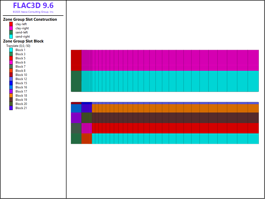 Figure 1 shows the geometry for this example, along with names assigned in two different groups by the Extruder tool. The top set of names in the “Construction” slot was assigned interactively, while the second set of names in the “Block” slot was assigned automatically by the Extruder. The excavation is 20 m wide and the final depth is 10 m. The diaphragm walls extend to a 30 m depth and are braced at the top by horizontal struts at a 2 m interval. The ground consists of two soil layers: a 20 m thick soft clay underlain by a stiff sand layer that extends to a great depth. The initial water table is at the ground surface.