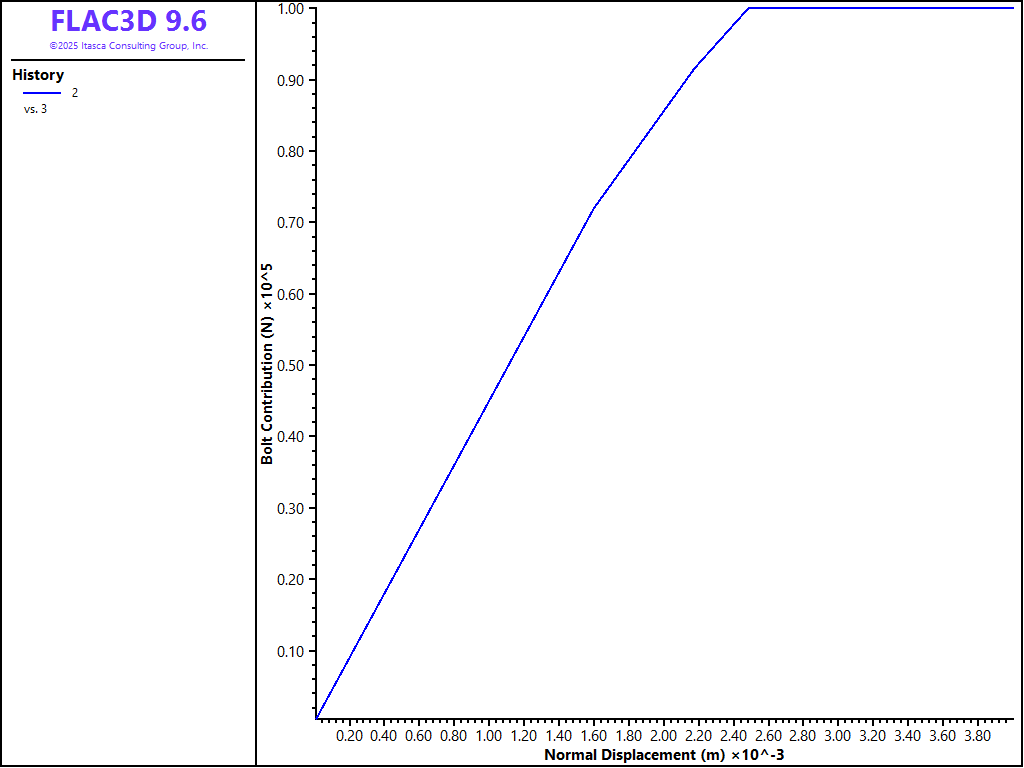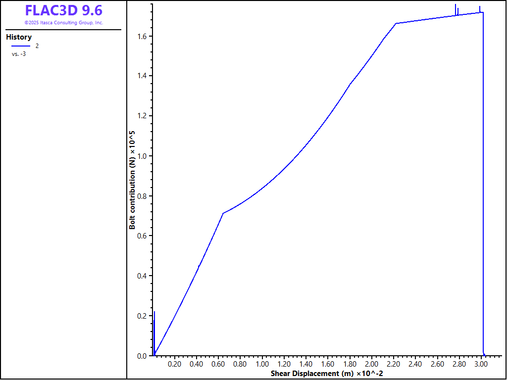 For the hybrid bolt, the dowel segment is assigned a yield strength of 0.063 MN and a strain limit of 0.3. Figure 2 shows the bolt contribution versus shear displacement. The bolt contribution is essentially the shear force minus the frictional strength (\(\sigma_n \tan \phi\)). At about 7 mm of shear displacement, the dowel segment yields. At about 2.1 cm, the cable itself yields in tension. Finally after about 3 cm of shear, the dowel ruptures and the bolt fails.