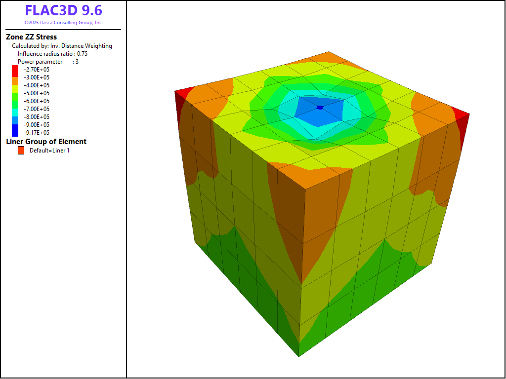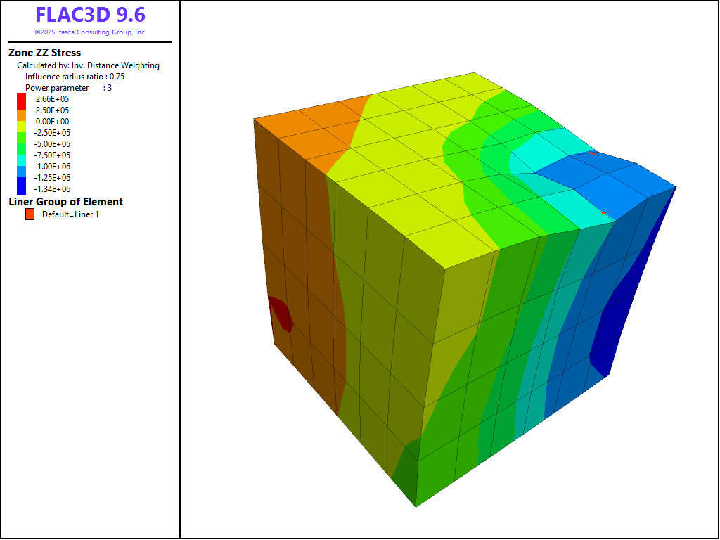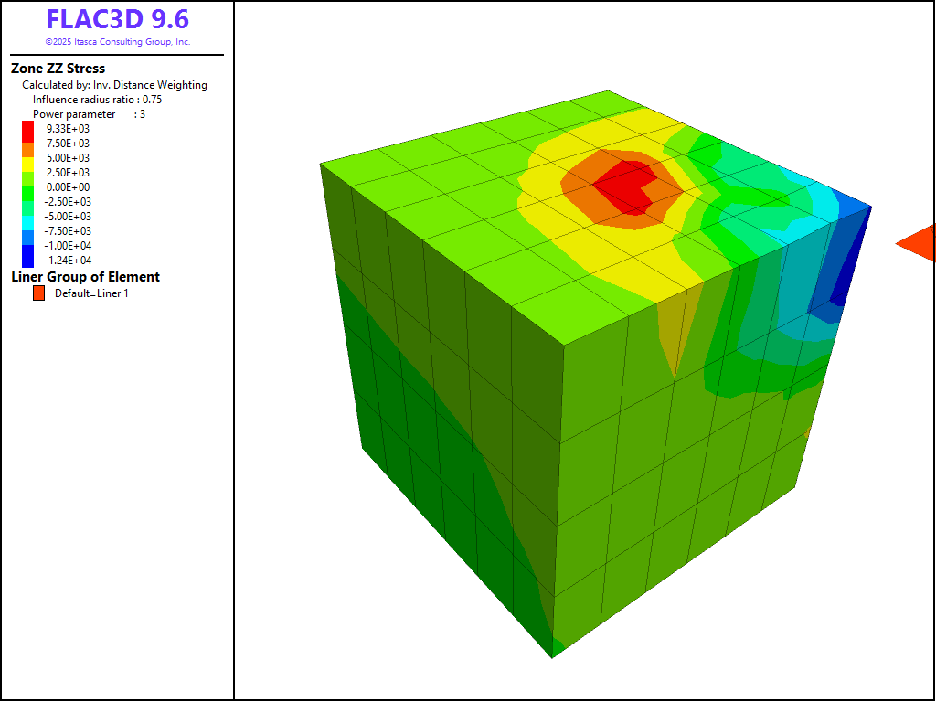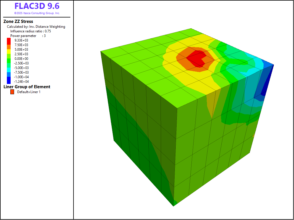 The FLAC3D model is a one cubic meter block of soil composed of 144 zones, with a 0.33 m2 concrete liner composed of 8 liner elements centered on top of the soil block, as shown in Figure 1. The soil is assigned elastic properties (\(E\) = 15 MPa, \(\nu\) = 0.3). The liner material is assigned properties corresponding with a concrete liner 0.1 m thick (\(E\) = 25 GPa, \(\nu\) = 0.15, \(t\) = 0.1 m), and the following liner-zone interface properties are assigned:
