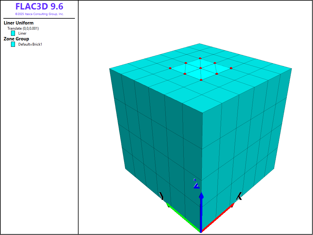 The FLAC3D model is a one cubic meter block of soil composed of 144 zones, with a 0.33 m2 concrete liner composed of 8 liner elements centered on top of the soil block, as shown in Figure 1. The soil is assigned elastic properties (\(E\) = 15 MPa, \(\nu\) = 0.3). The liner material is assigned properties corresponding with a 0.1 m thick concrete liner (\(E\) = 25 GPa, \(\nu\) = 0.15, \(t\) = 0.1 m). The liner-zone interface properties (\(k_n\), \(k_s\), \(f_t\), \(c\), \(c_r\), \(\phi\)) are assigned as follows.