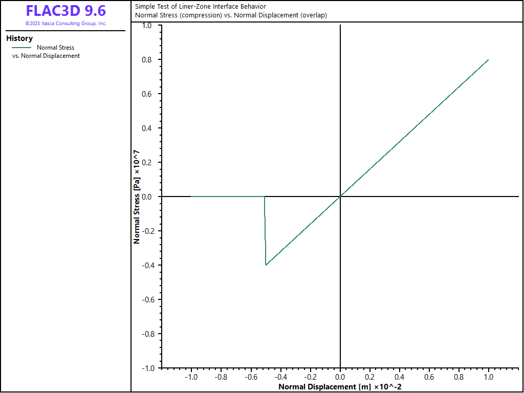 In order to demonstrate the liner-zone interface behavior, the following conditions are imposed. The velocities of all gridpoints and nodes are fully fixed. The same velocities are applied to all nodes such that the liner moves as a rigid body. These conditions prevent internal stresses from developing in both the zones and the liner material; only the liner-zone interface springs are being exercised. The normal and shear stress and displacement at the center coupling spring is monitored and plotted. In the plots of normal stress versus normal displacement, the sign convention is that compression and overlap are positive (to correspond with the figure representing normal interface behaviors). In the plots of shear stress versus shear displacement, the magnitude of both shear stress and shear displacement are plotted (to correspond with the figure representing shear interface behaviors).