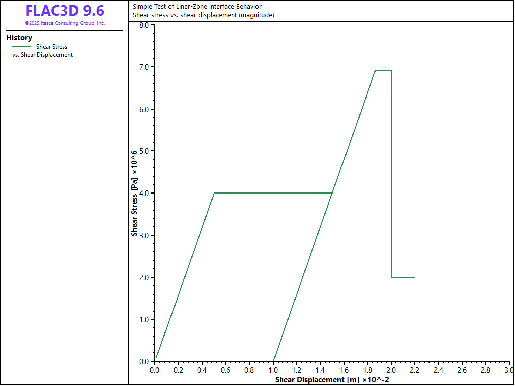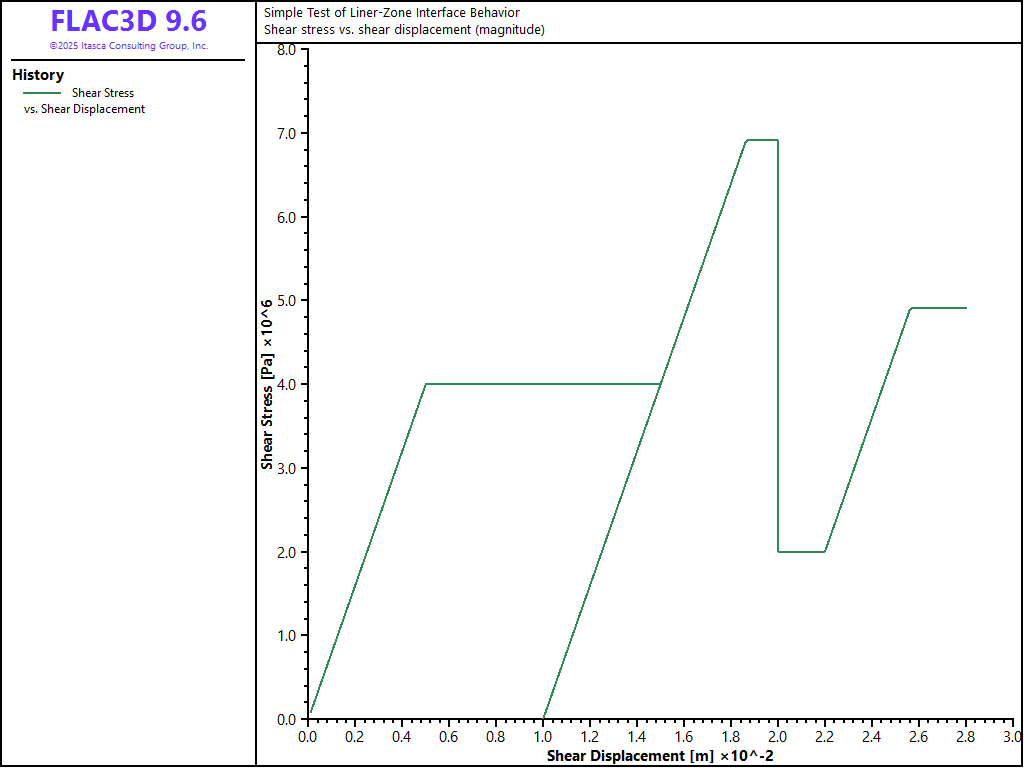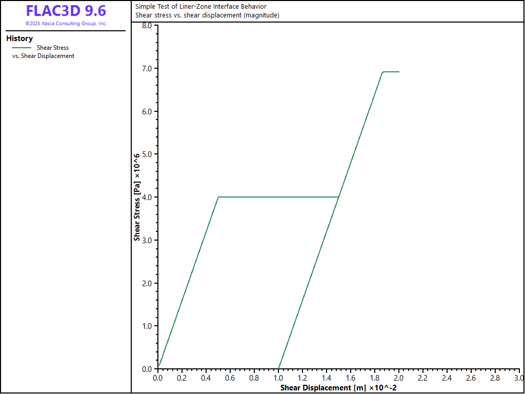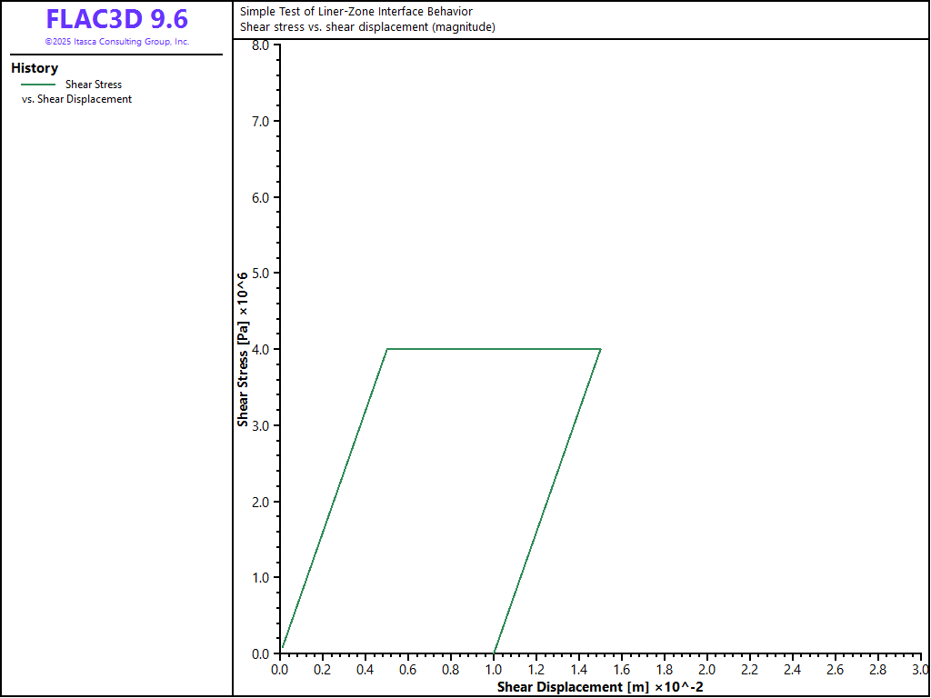 A liner is placed on top of a soil block and then moved in various directions. The normal and shear stress and displacement of one of the liner coupling springs is monitored and plotted to demonstrate the effects of the liner-zone interface properties on system response.