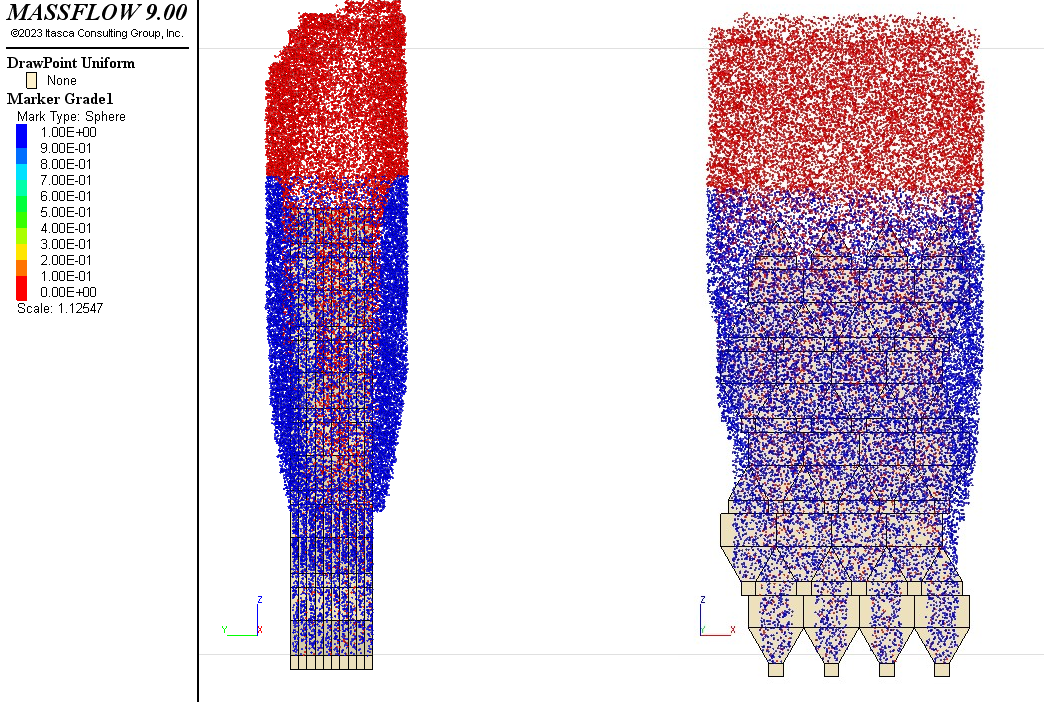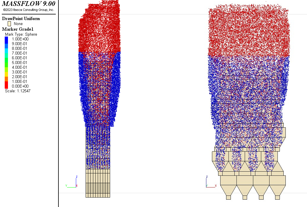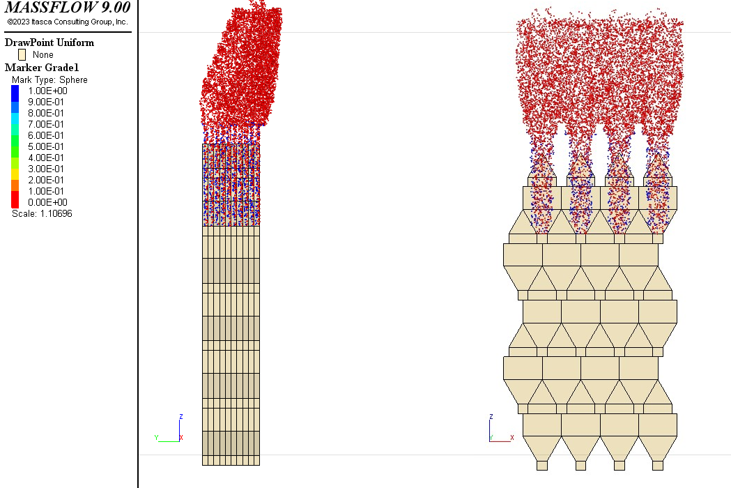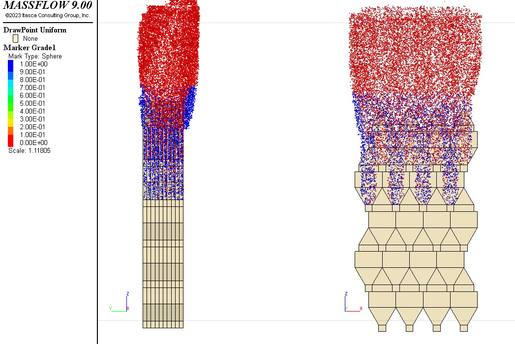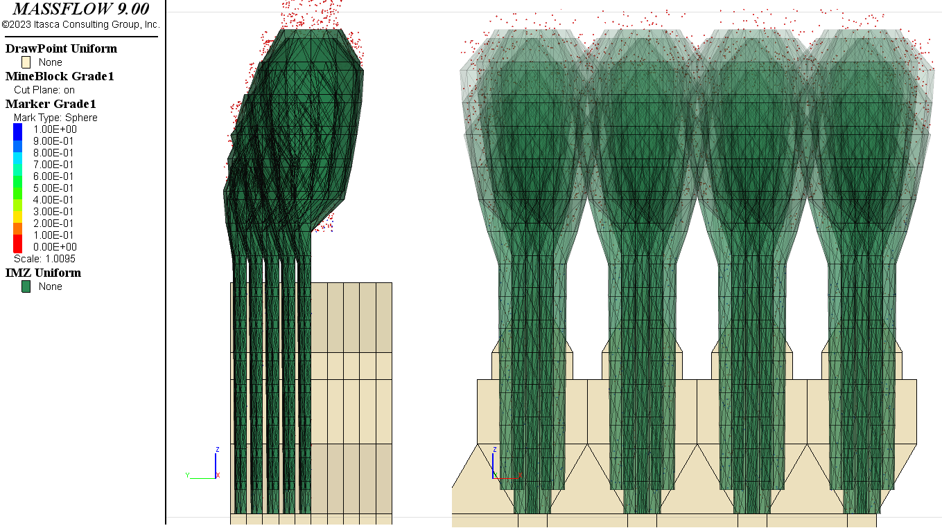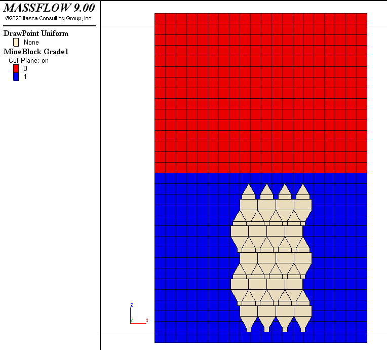This example demonstrates how to implement a SubLevel Caving method within MassFlow. The example is fairly simple, using a set of drawpoint, but it illustrates the method of extraction.