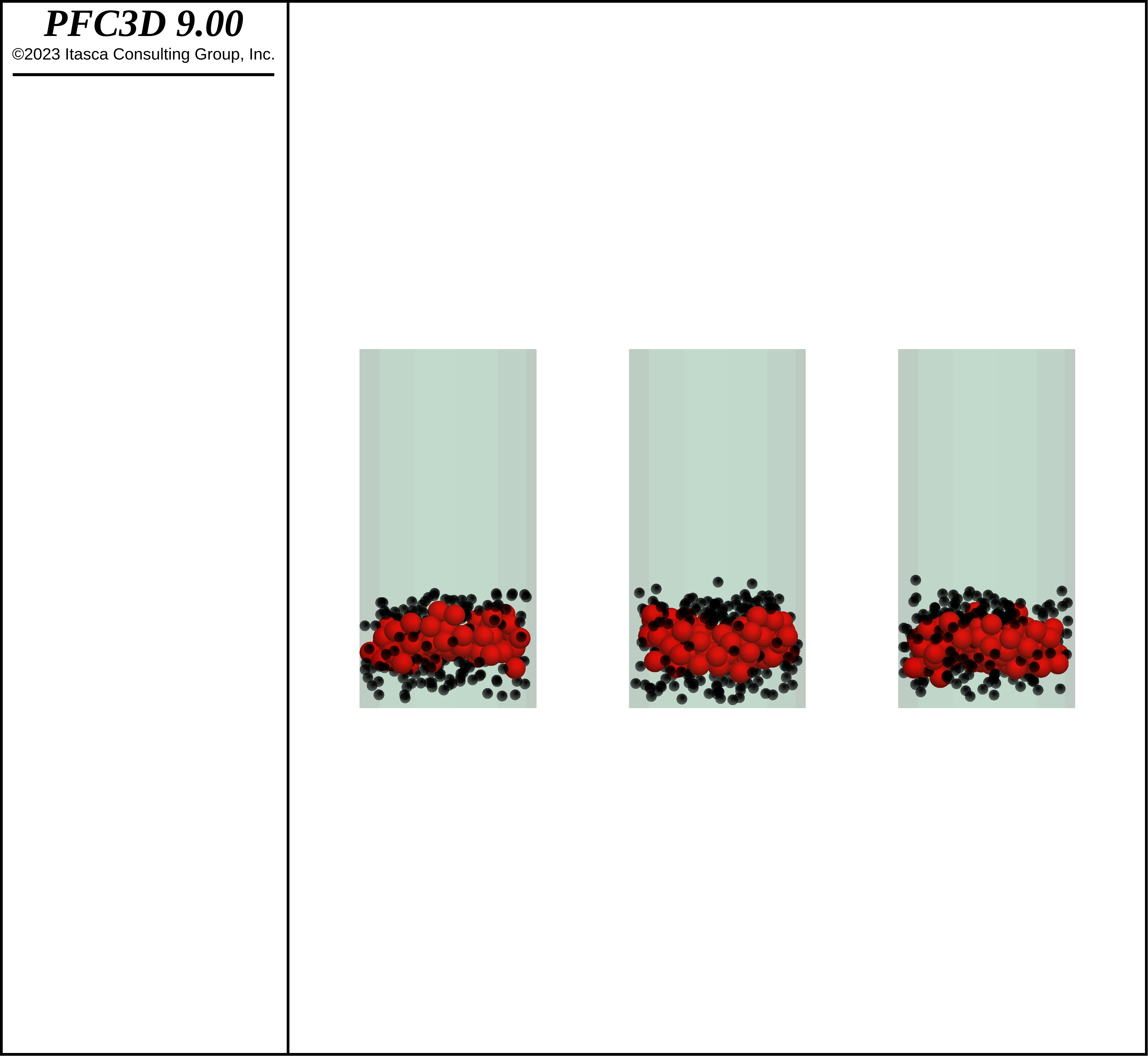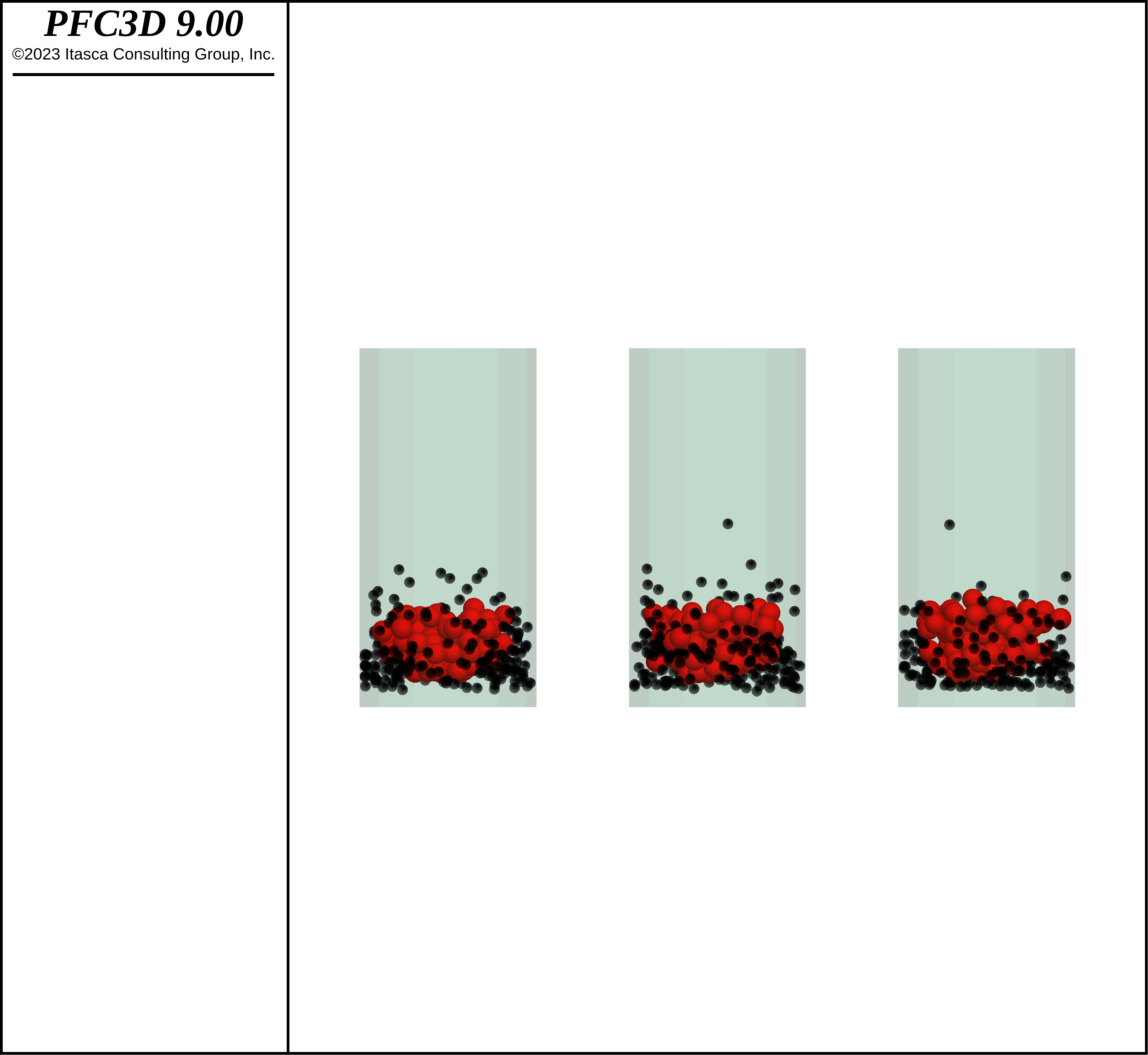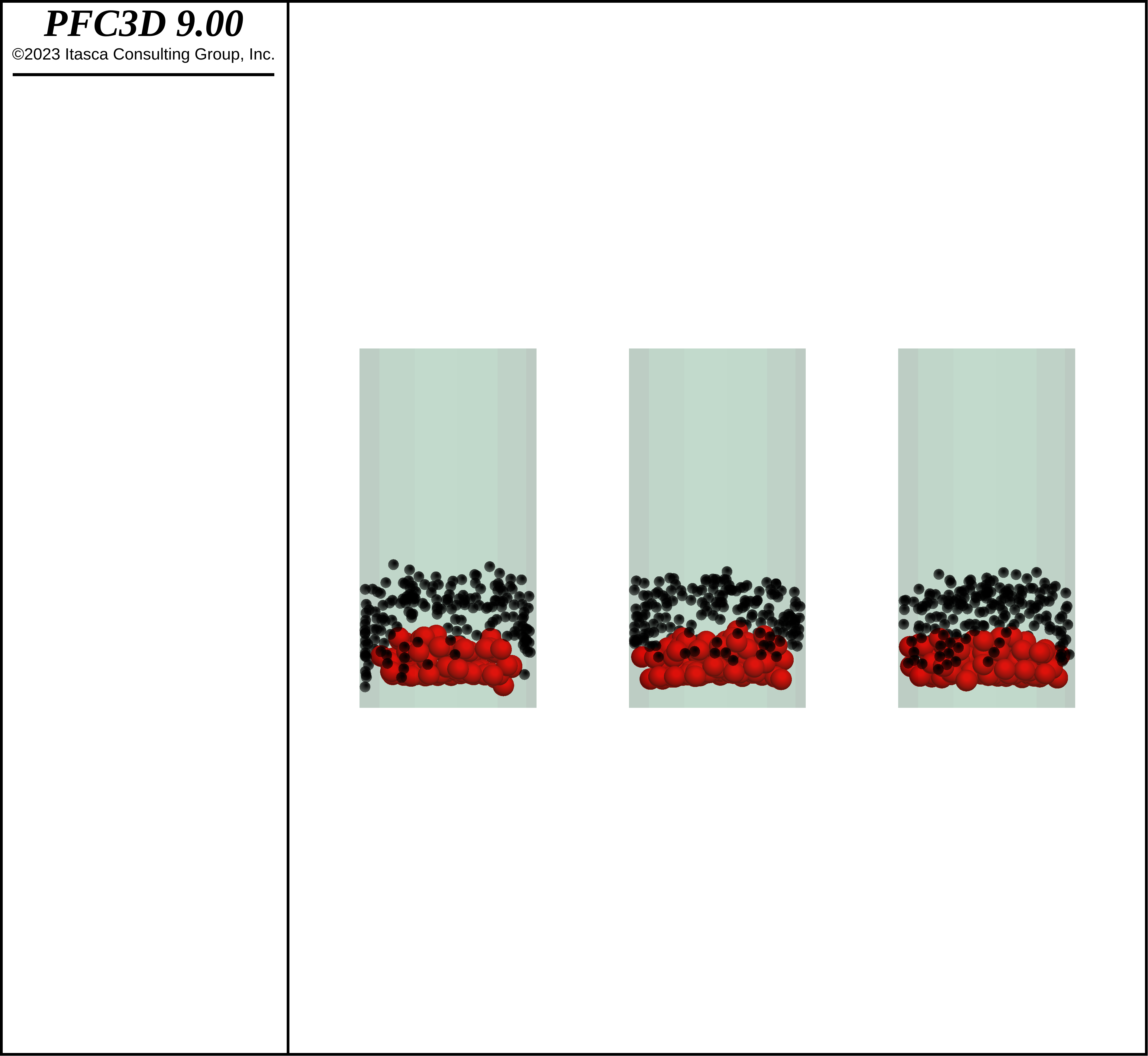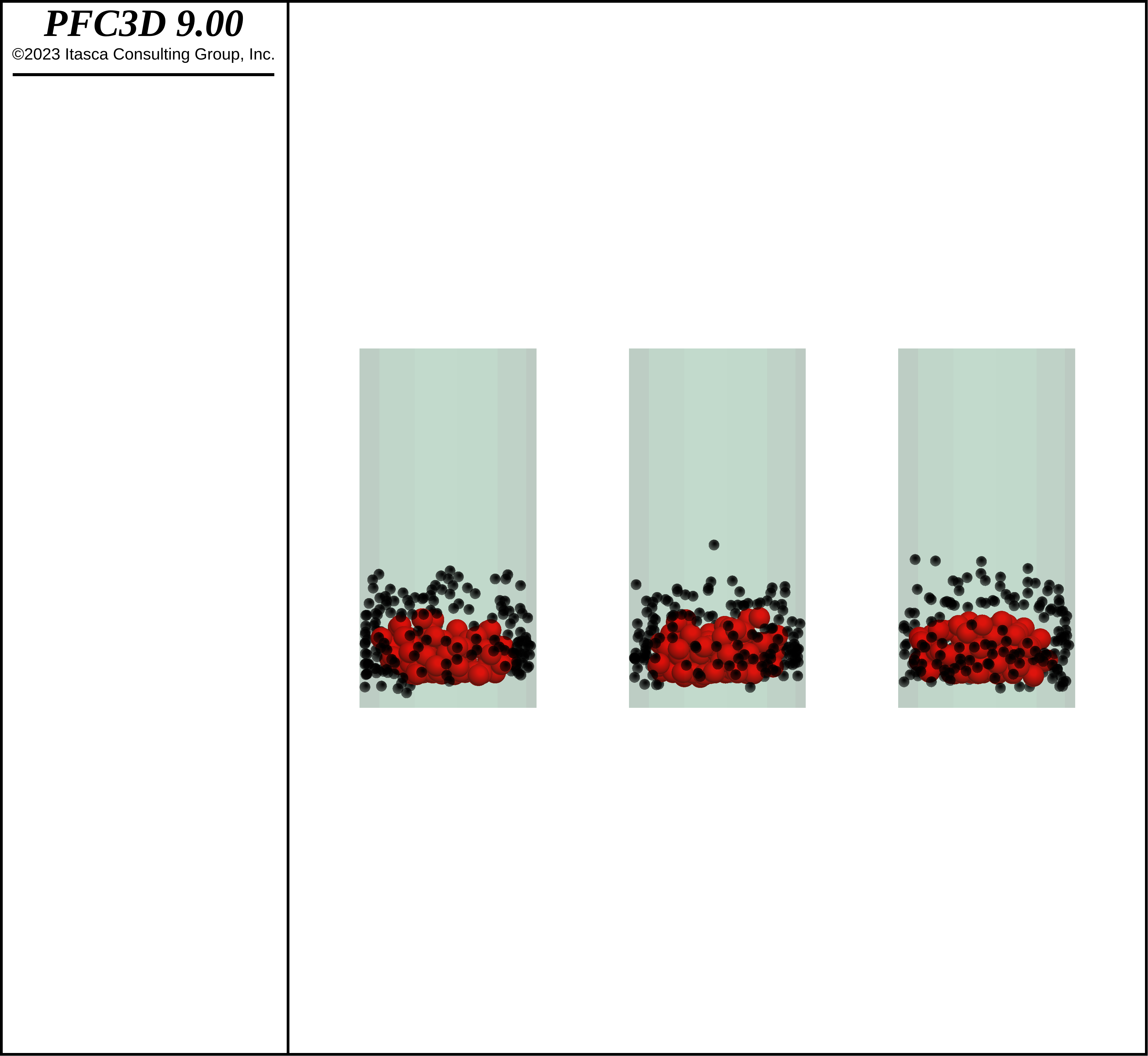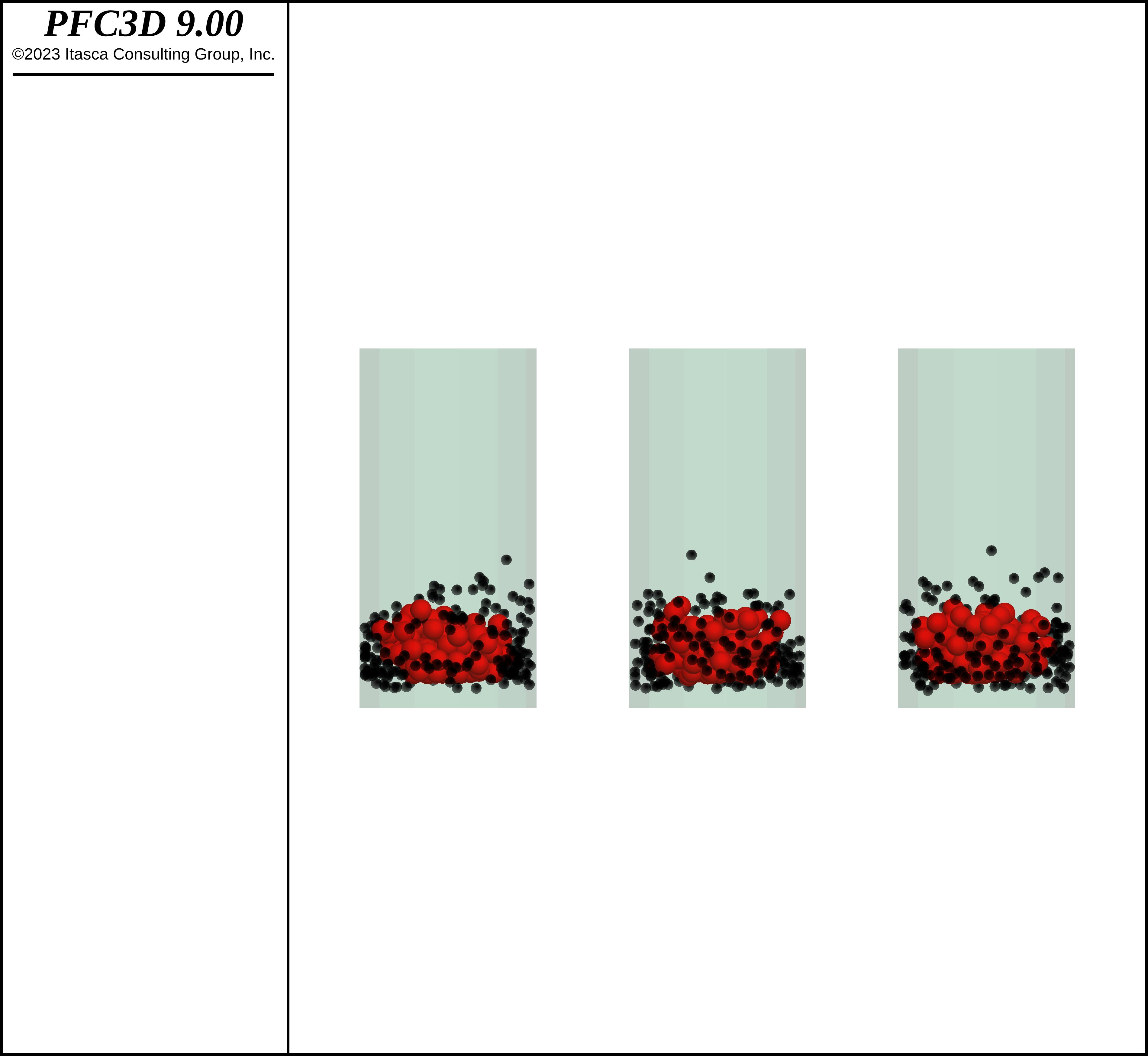 Many granular flow simulations often seek to gain insights into problems comprised of many millions, billions, or even trillions of individual particles. PFC has been used to successfully simulate models ranging from caldera collapse and landslides to powder mixing and tablet compaction, in spite of the fact that model sizes are limited to less than 10 million balls for most practical purposes. It is often not feasible computationally to tackle such problems by modeling each individual particle, regardless of the computational resources available. Frequently one either restricts the volume of material to be modeled considerably or particles are upscaled. Particle upscaling, or coarse graining, is the process of increasing particle sizes, sometimes by more than a few orders of magnitude, while retaining the bulk physical response. In order to gain sensible results, though, upscaled models must be calibrated against known physical tests. [Lommen2019], and references therein, demonstrate some approaches to upscaling particle sizes, resulting in predictive numerical models with reasonable computational durations. In nearly all cases, upscaling requires calibration with a number of laboratory scale tests, such as angle of repose tests, shear box tests, hopper flow tests, etc. In this specific problem, the number of balls is very small and fixed, so particle upscaling is not a feasible method for improving the model performance. When upscaling particles one must also think about the pertinent model dimensions relative to the particle sizes. If the goal is to model a layer of balls in the container, as in this problem, it is advisable that a ball layer has roughly 8 or more balls across the dimension of the container. This same logic applies to having balls flow through orifices, as balls that are too large may jam unrealistically due to hitting the model boundaries. Thus, another important consideration to particle upscaling involves assessing the smallest features of your model boundaries/geometry that may be impact the model response; if particles are large compared to such features then one cannot expect the model to capture the response adequately.