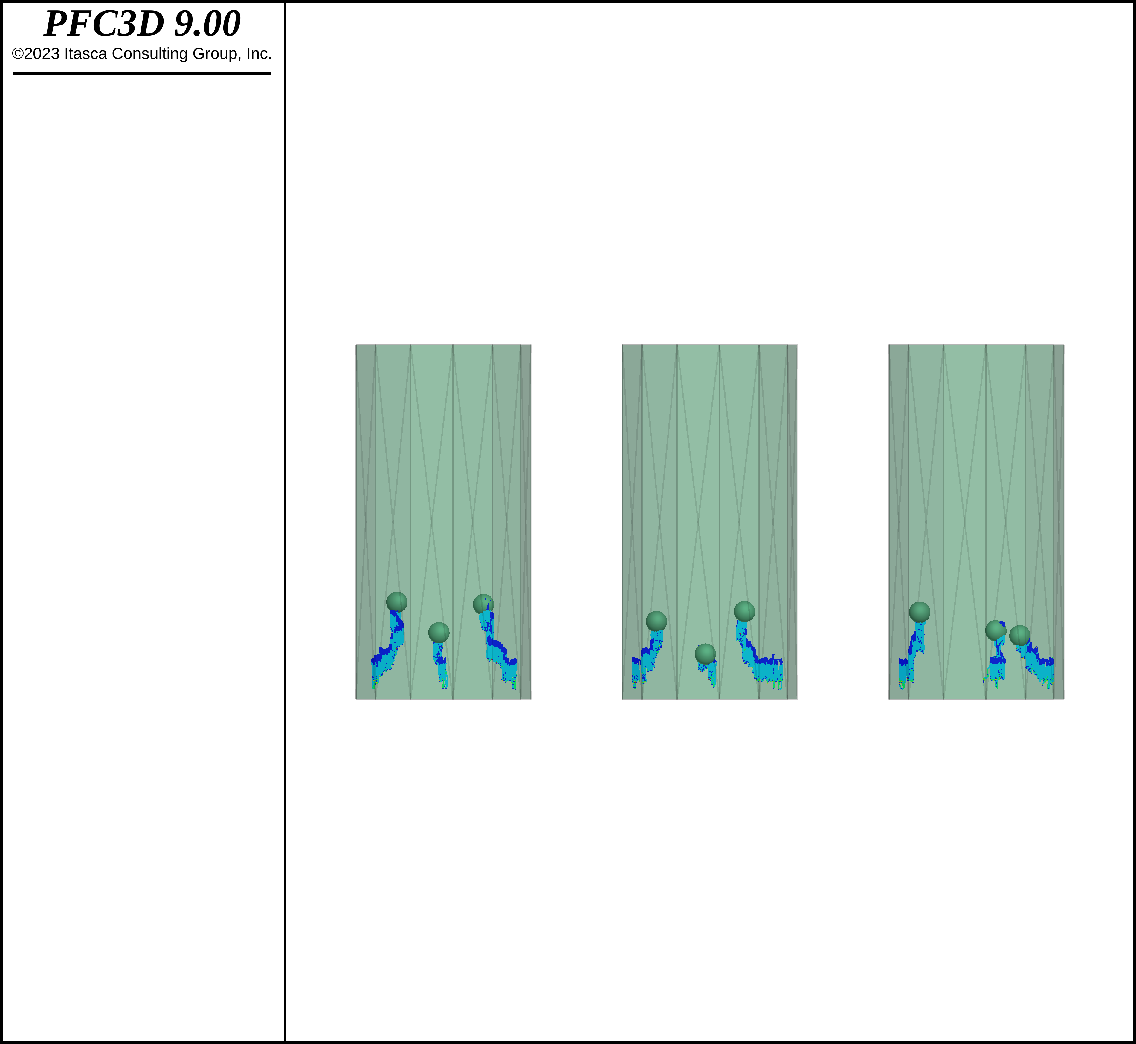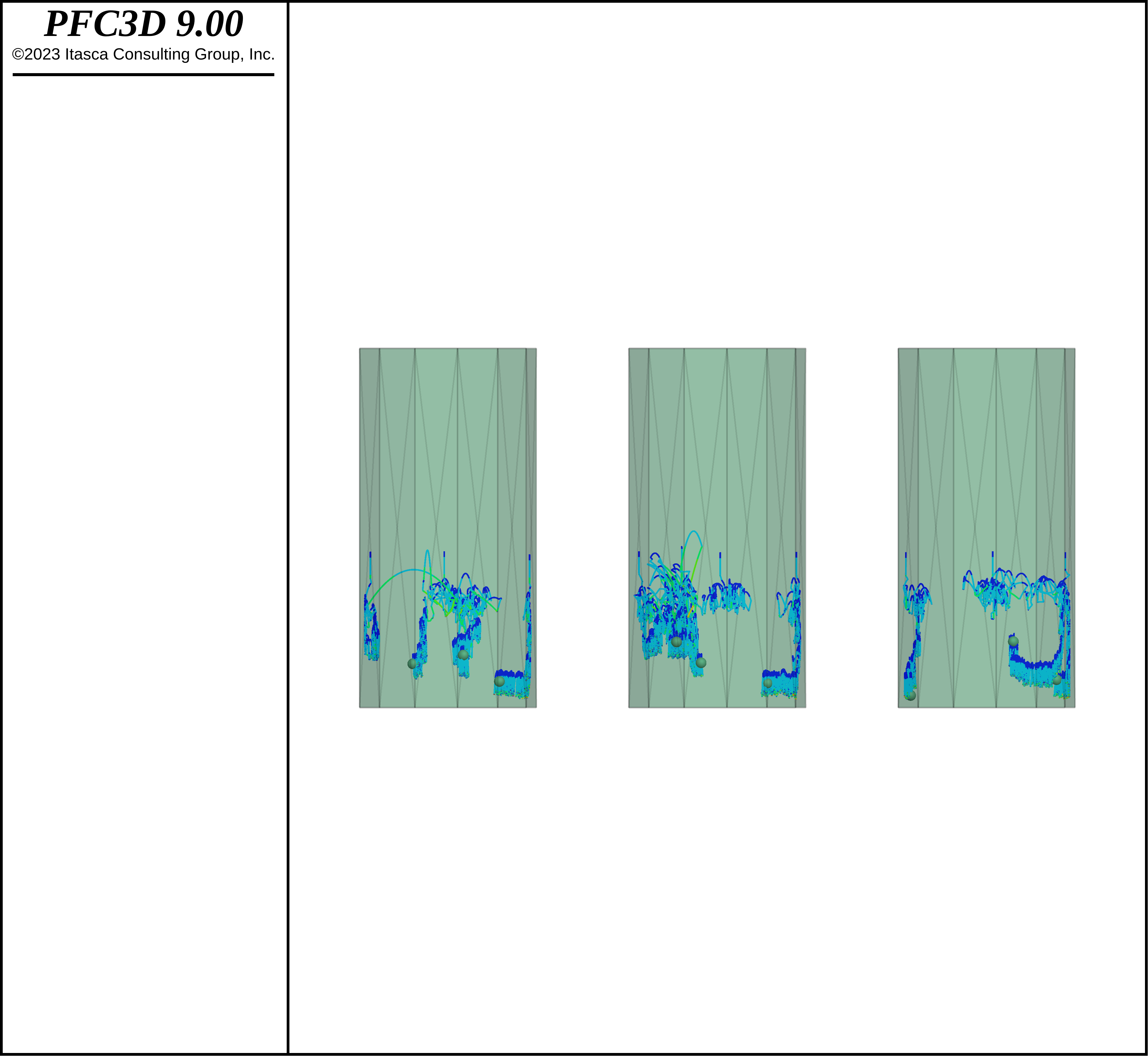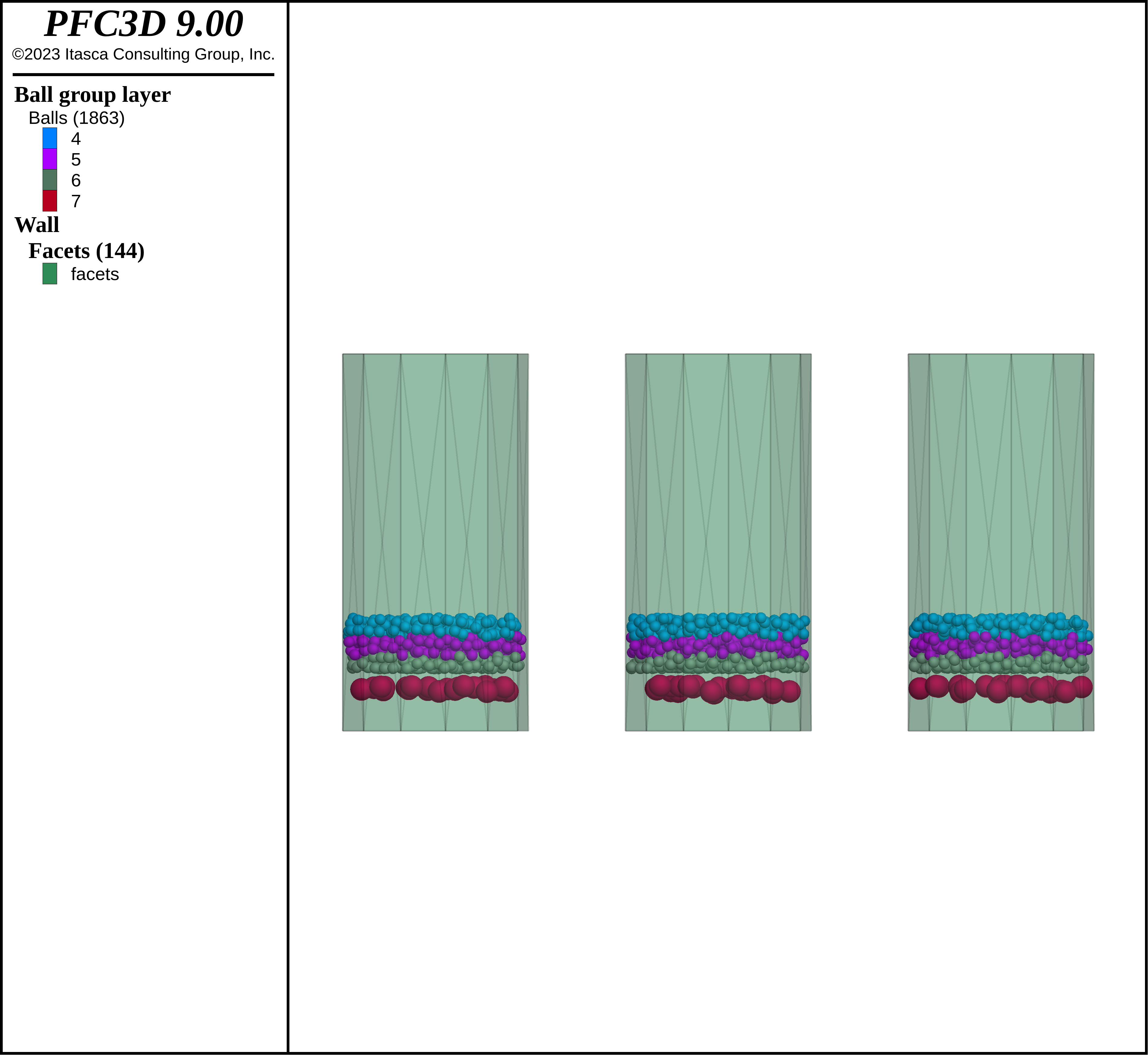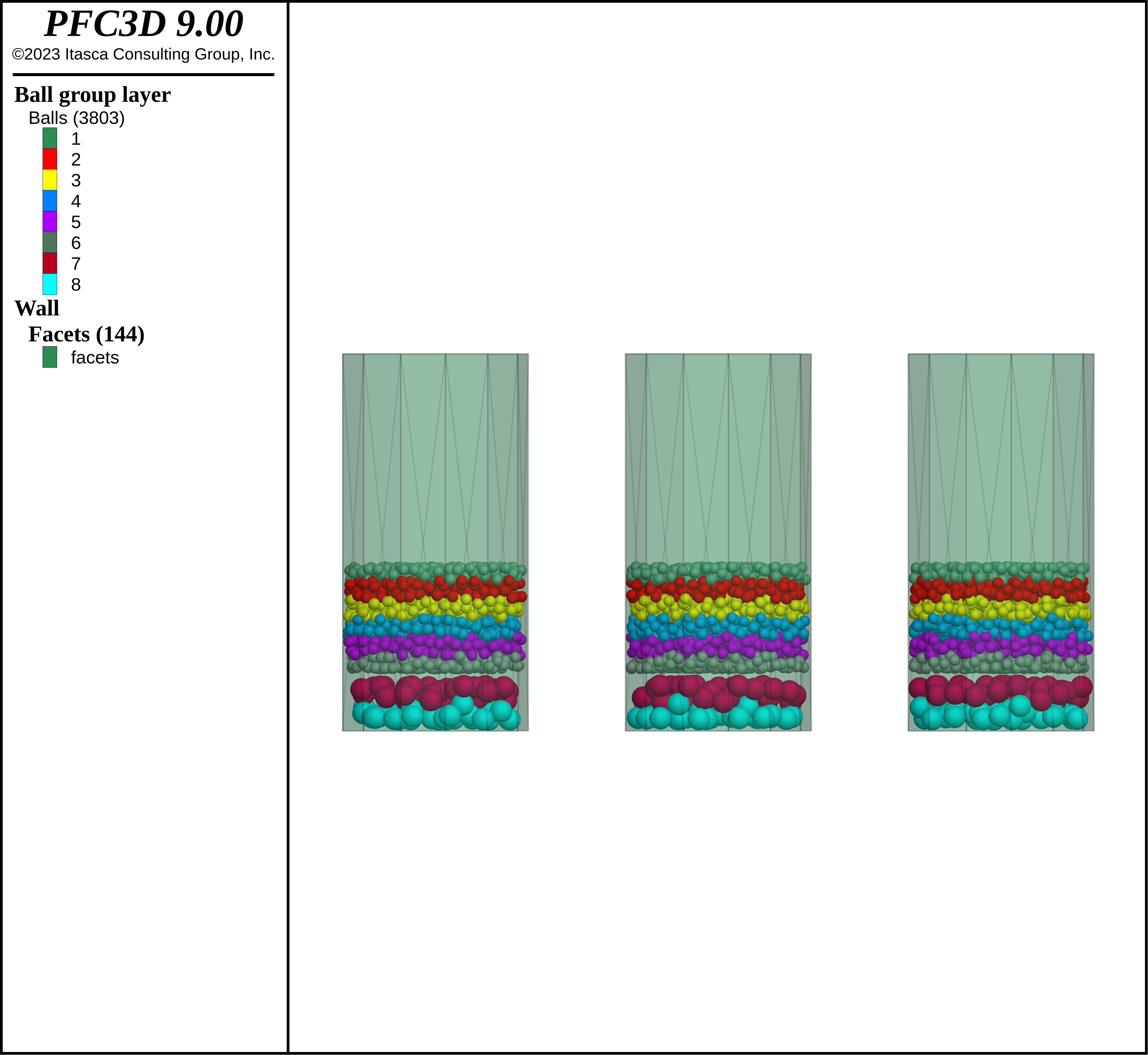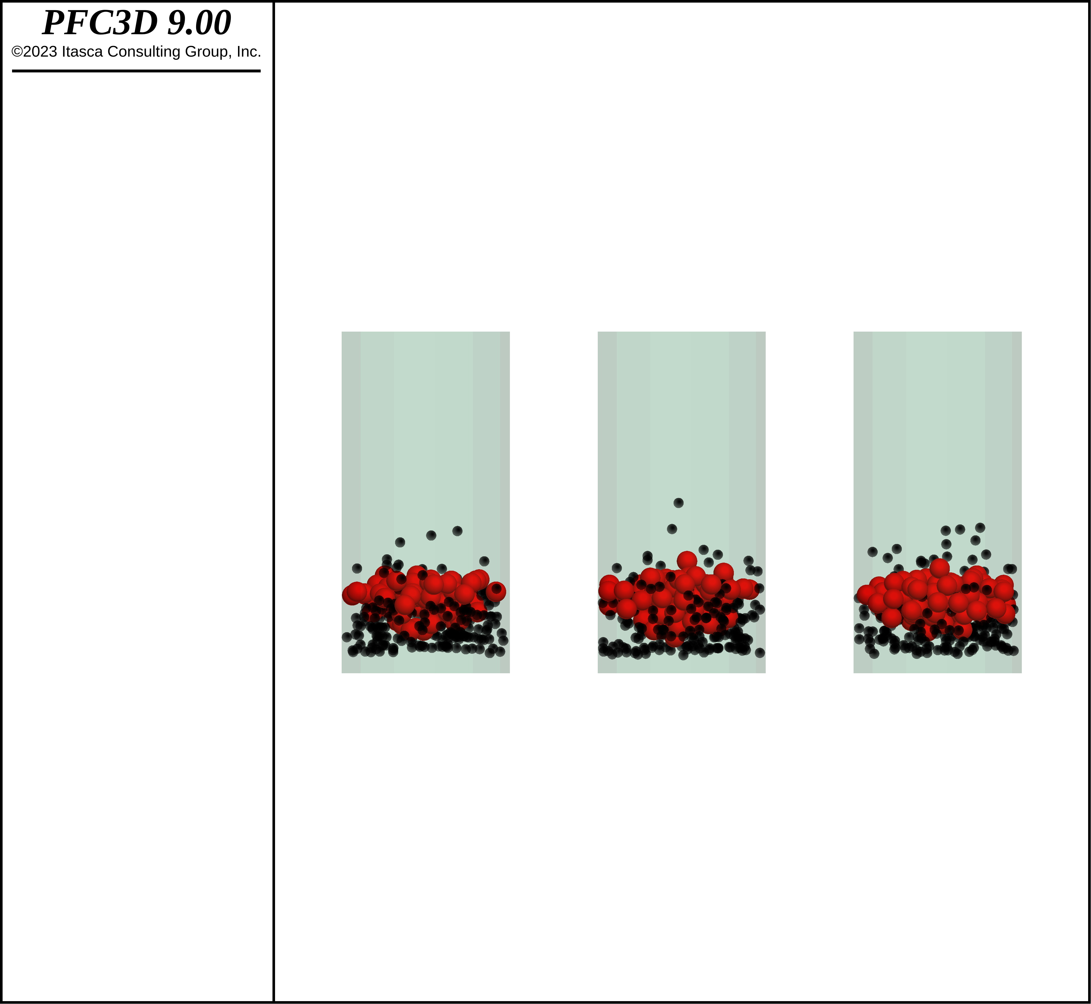 Many granular flow simulations often seek to gain insights into problems comprised of many millions, billions, or even trillions of individual particles. PFC has been used to successfully simulate models ranging from caldera collapse and landslides to powder mixing and tablet compaction, in spite of the fact that model sizes are limited to less than 10 million balls for most practical purposes. It is often not feasible computationally to tackle such problems by modeling each individual particle, regardless of the computational resources available. Frequently one either restricts the volume of material to be modeled considerably or particles are upscaled. Particle upscaling, or coarse graining, is the process of increasing particle sizes, sometimes by more than a few orders of magnitude, while retaining the bulk physical response. In order to gain sensible results, though, upscaled models must be calibrated against known physical tests. [Lommen2019], and references therein, demonstrate some approaches to upscaling particle sizes, resulting in predictive numerical models with reasonable computational durations. In nearly all cases, upscaling requires calibration with a number of laboratory scale tests, such as angle of repose tests, shear box tests, hopper flow tests, etc. In this specific problem, the number of balls is very small and fixed, so particle upscaling is not a feasible method for improving the model performance. When upscaling particles one must also think about the pertinent model dimensions relative to the particle sizes. If the goal is to model a layer of balls in the container, as in this problem, it is advisable that a ball layer has roughly 8 or more balls across the dimension of the container. This same logic applies to having balls flow through orifices, as balls that are too large may jam unrealistically due to hitting the model boundaries. Thus, another important consideration to particle upscaling involves assessing the smallest features of your model boundaries/geometry that may be impact the model response; if particles are large compared to such features then one cannot expect the model to capture the response adequately.