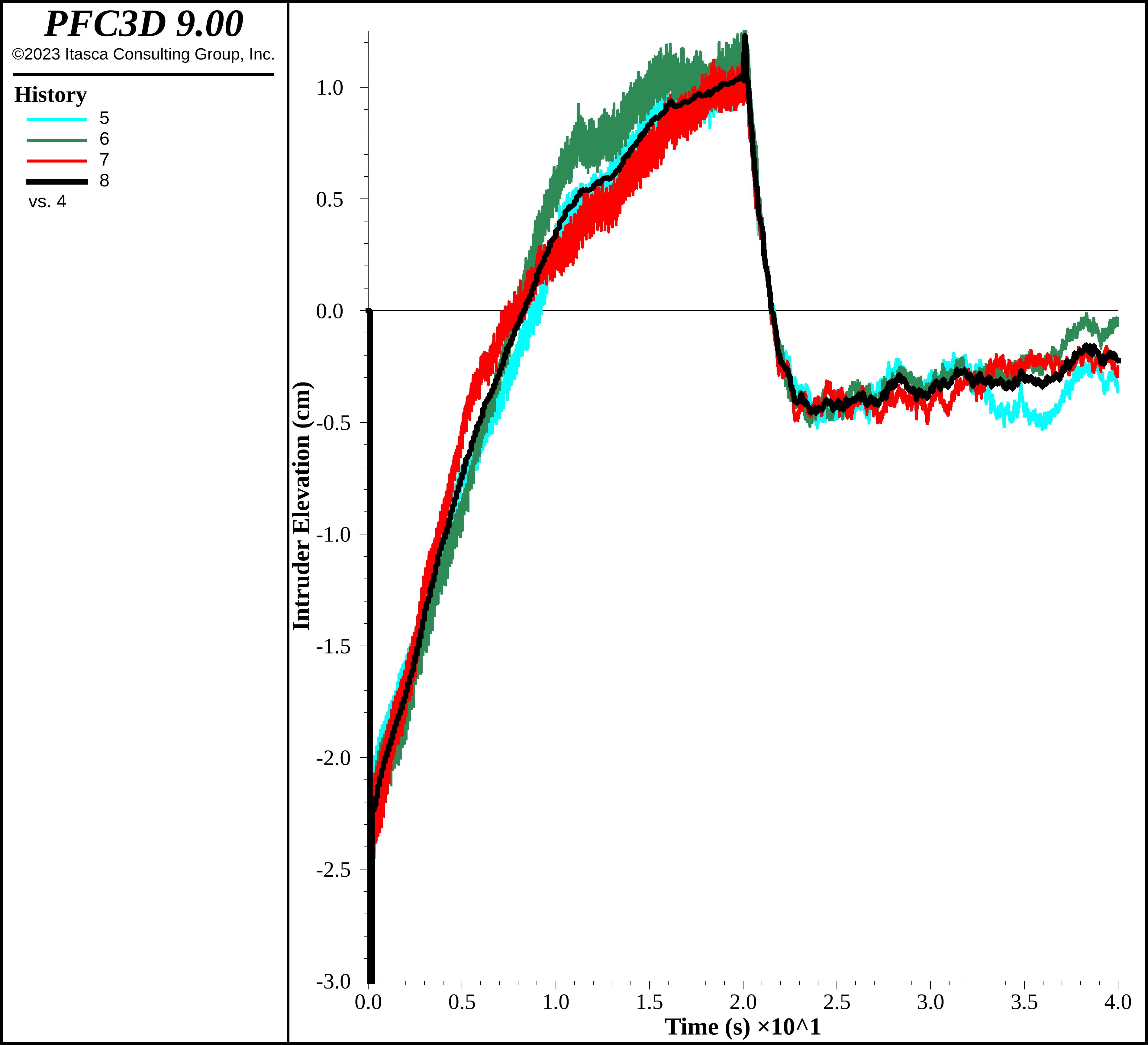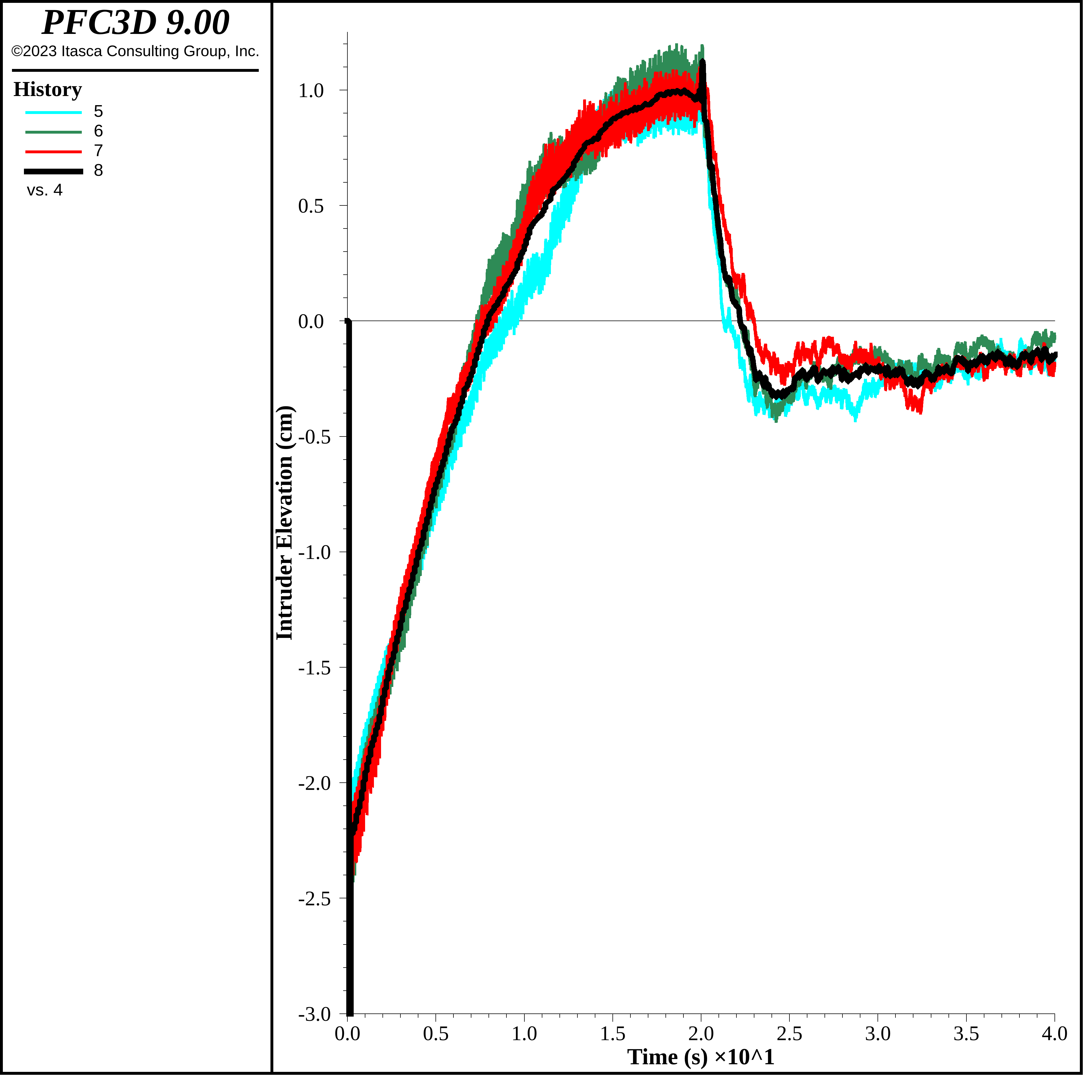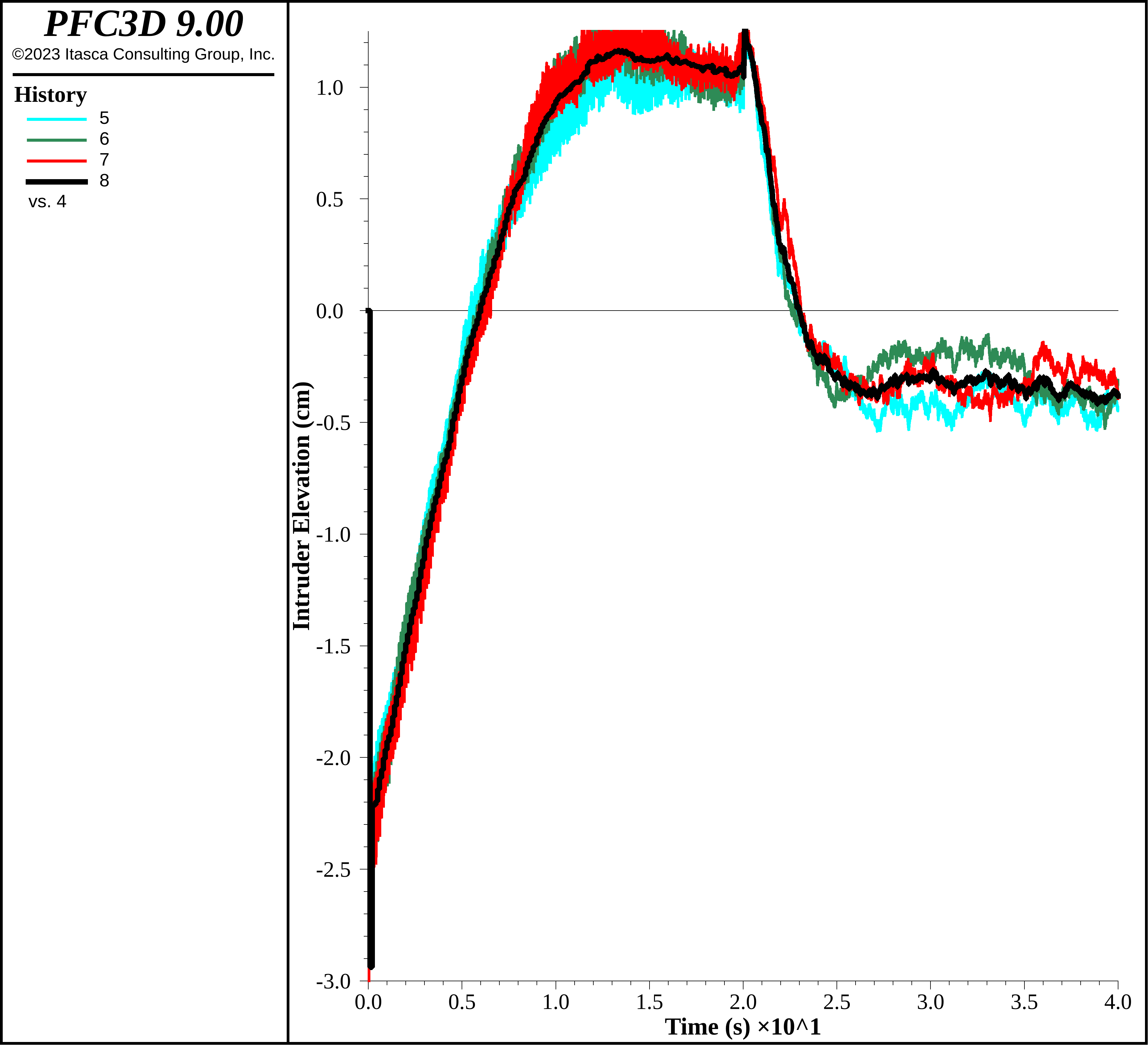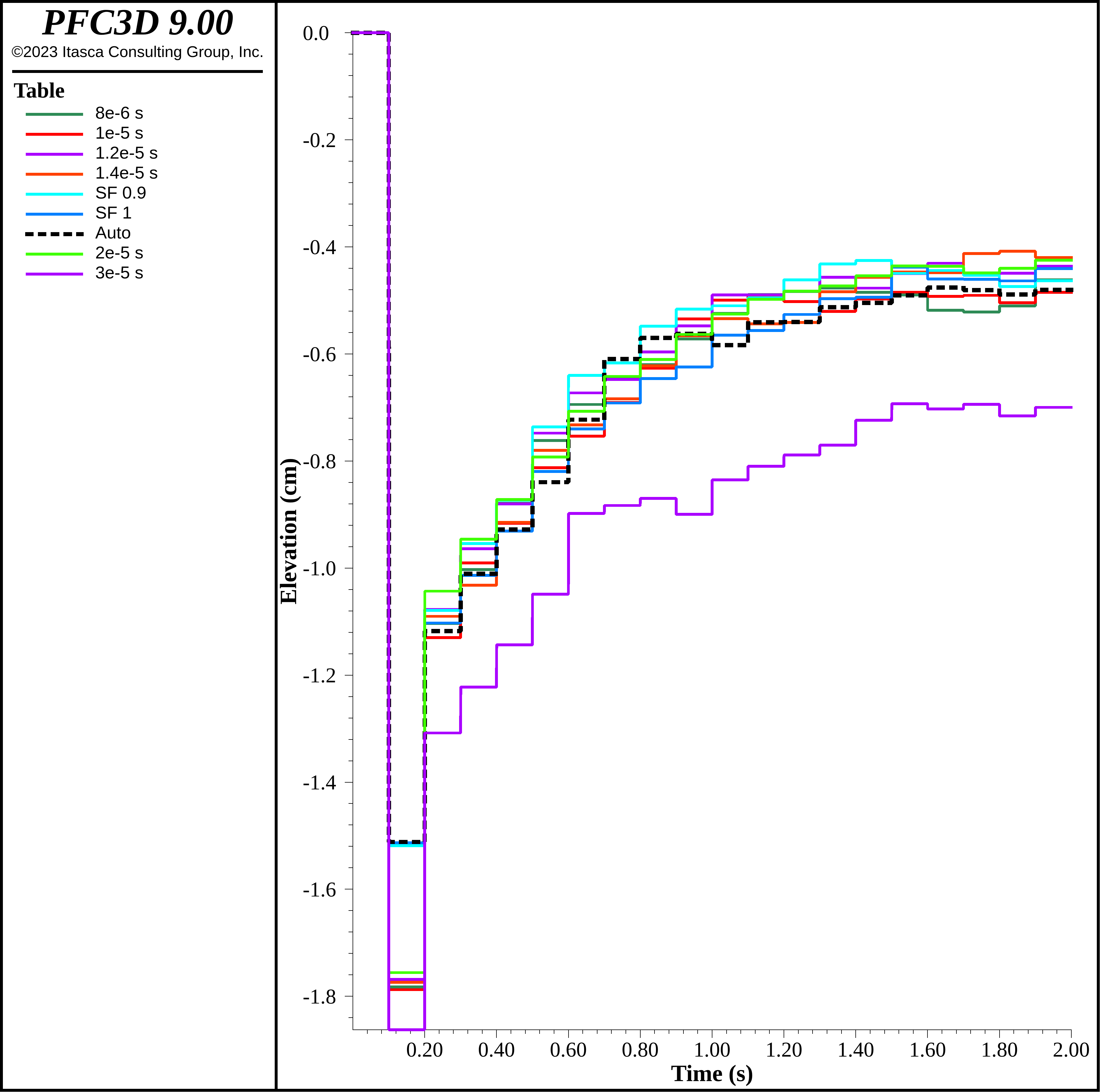 The figure below shows the intruder elevation with changes in the timestep, both fixing it (to values 8e-6 s, 1e-5 s, 1.2e-5 s, 2e-5 s and 3e-5 s) and for changing the timestep safety factor to 0.9 and 1.0 relative to the default settings. The table below shows the run times and number of cycles for each scenario. As can be observed, the model response are relatively insensitive to the timestep schemes up to perhaps 2e-5 s. The 3e-5 s model produced a substantially different response, though. Modifying the safety factor has a moderate impact on run time, on the order of 10%. Choosing a rather large timestep, such as 2e-5 s, can have a much larger impact, though the timestep must be chosen wisely. The model results below present both the automatic scheme and using a timestep of 2e-5.