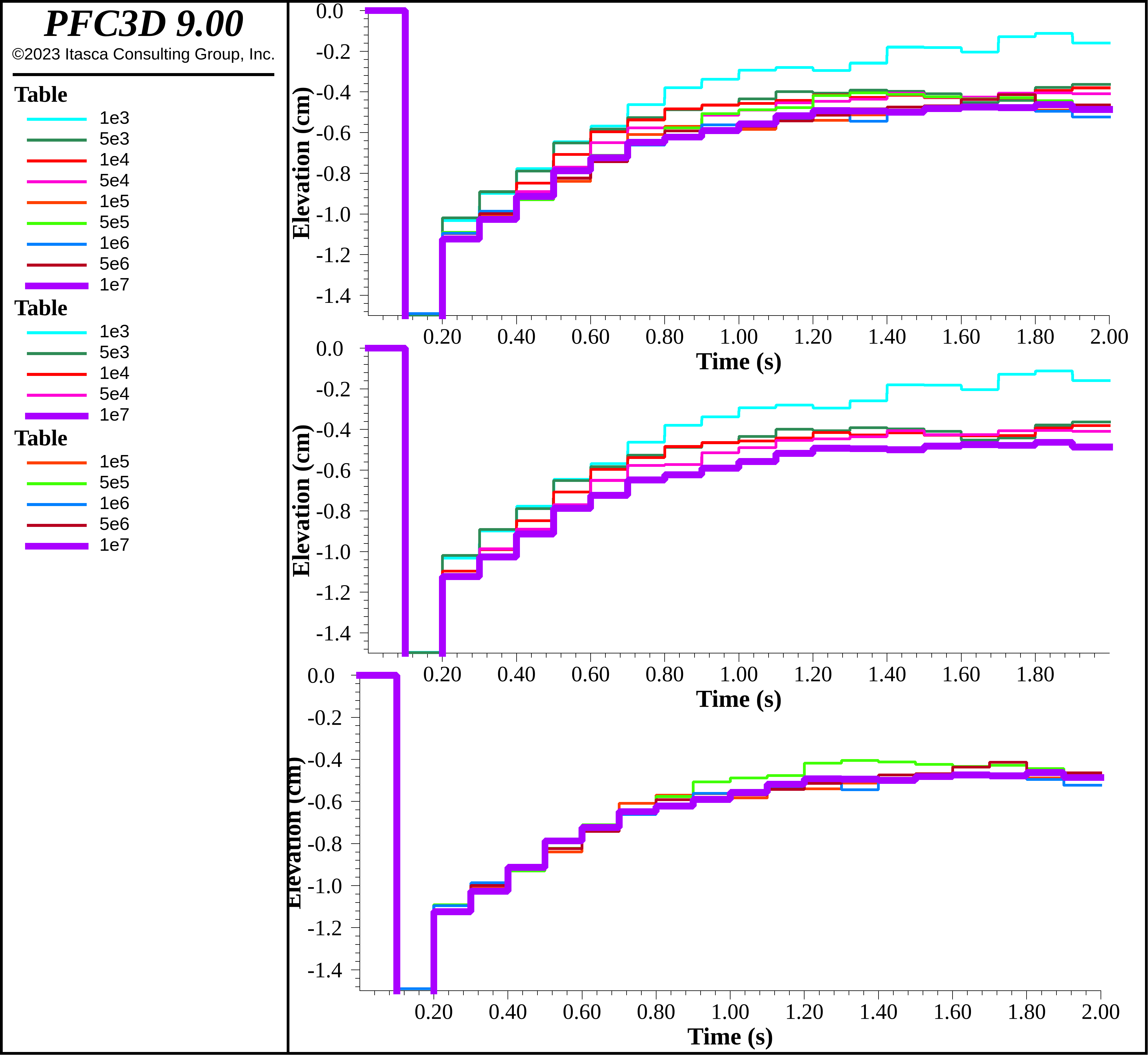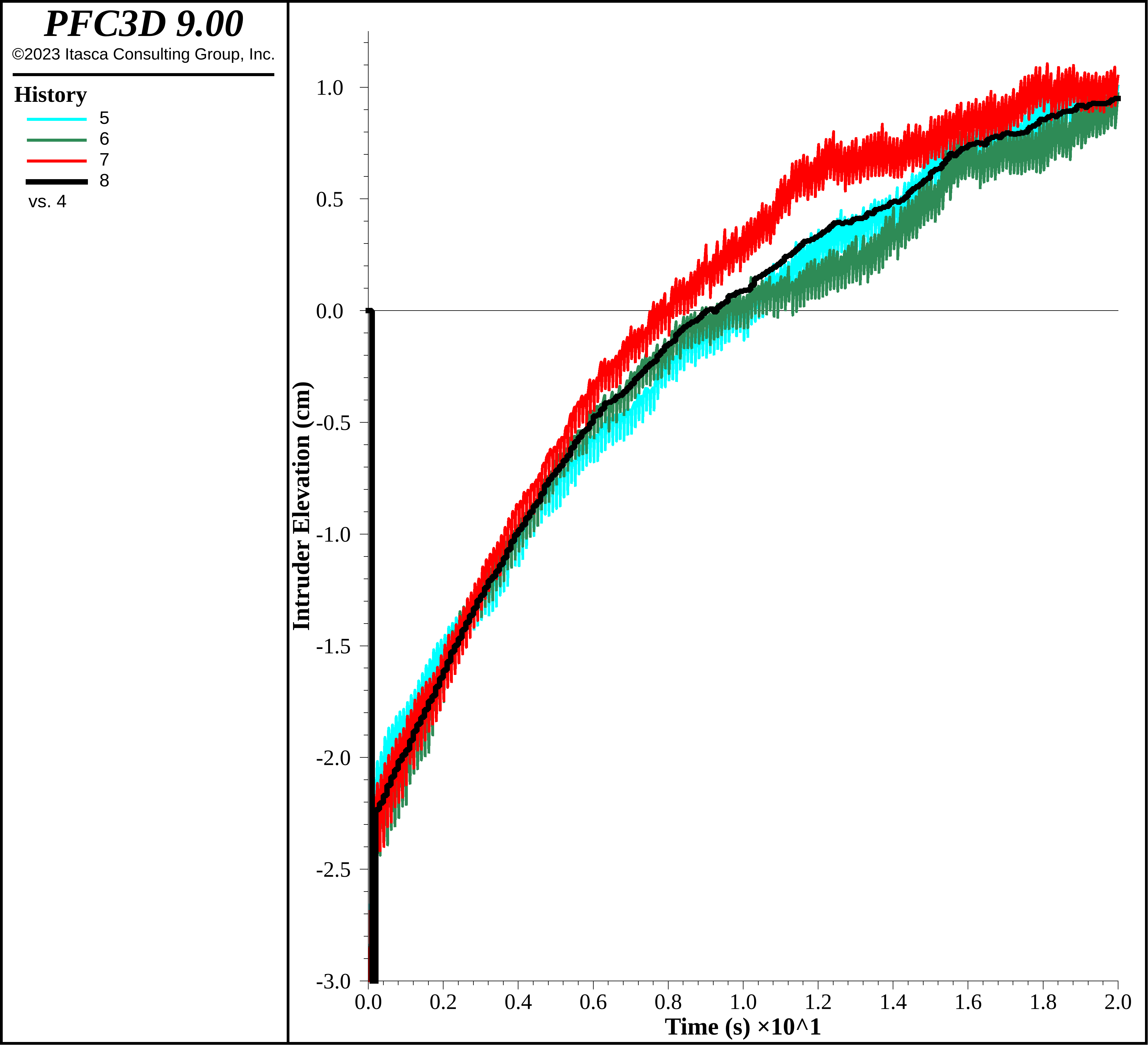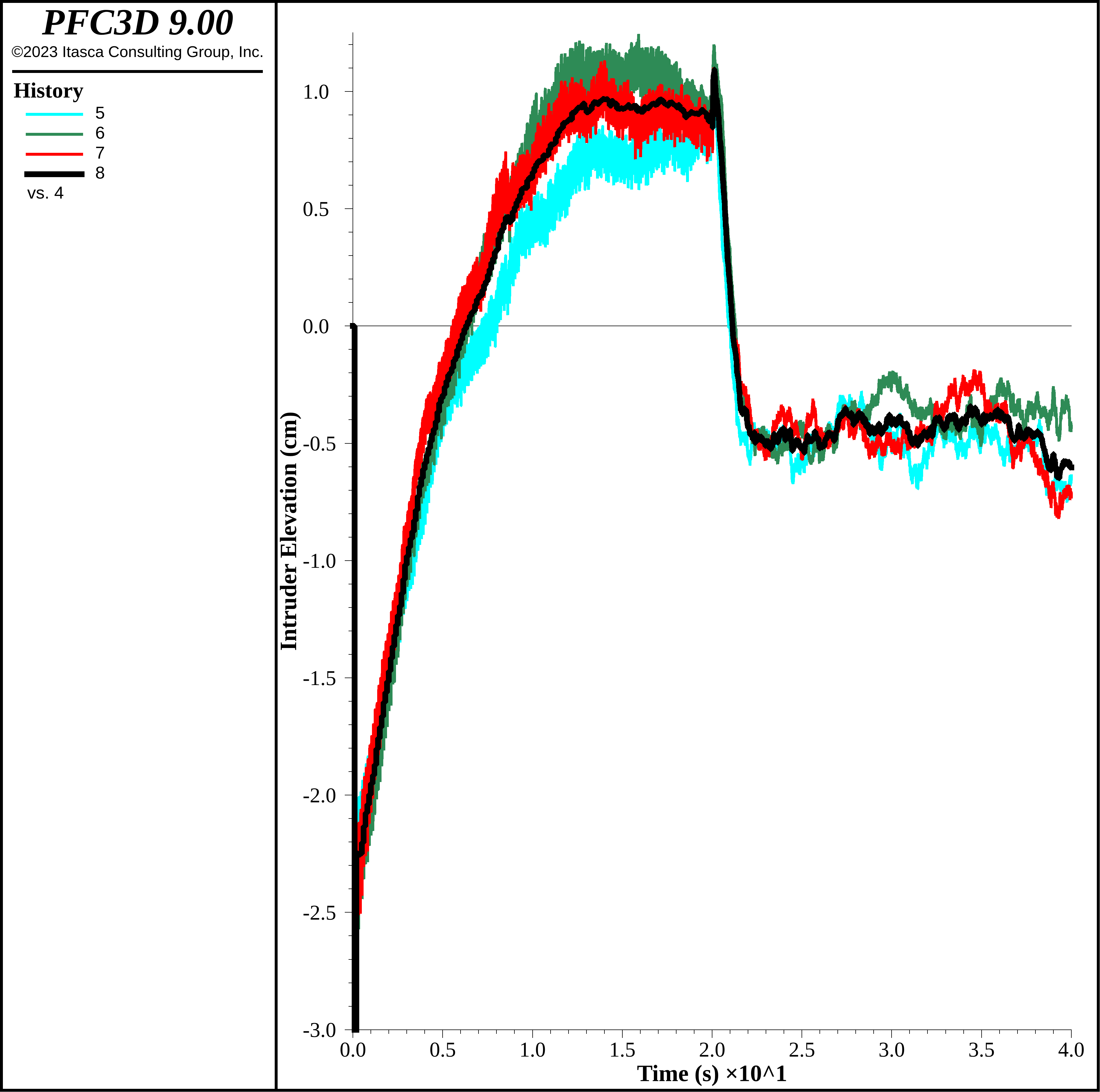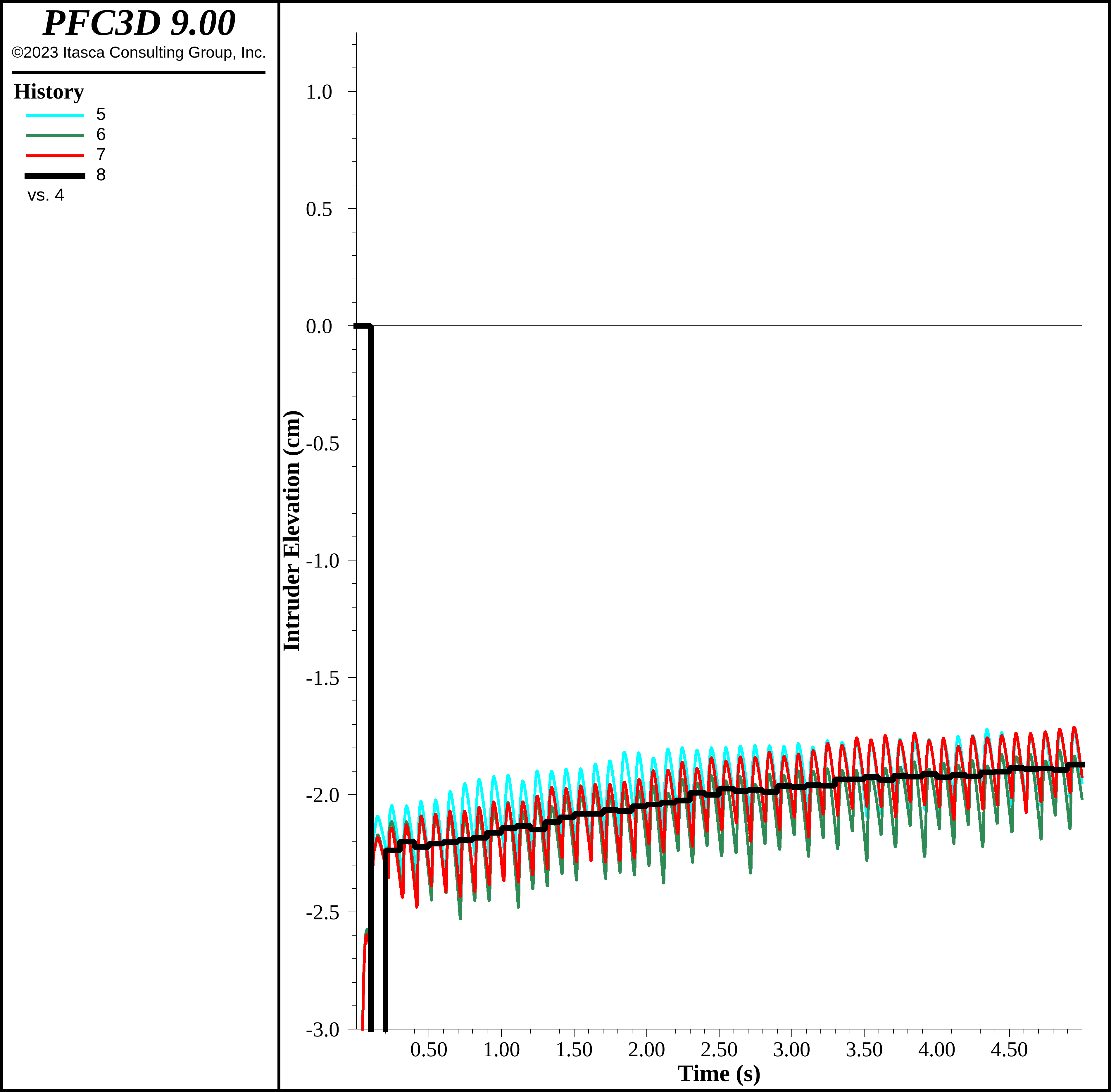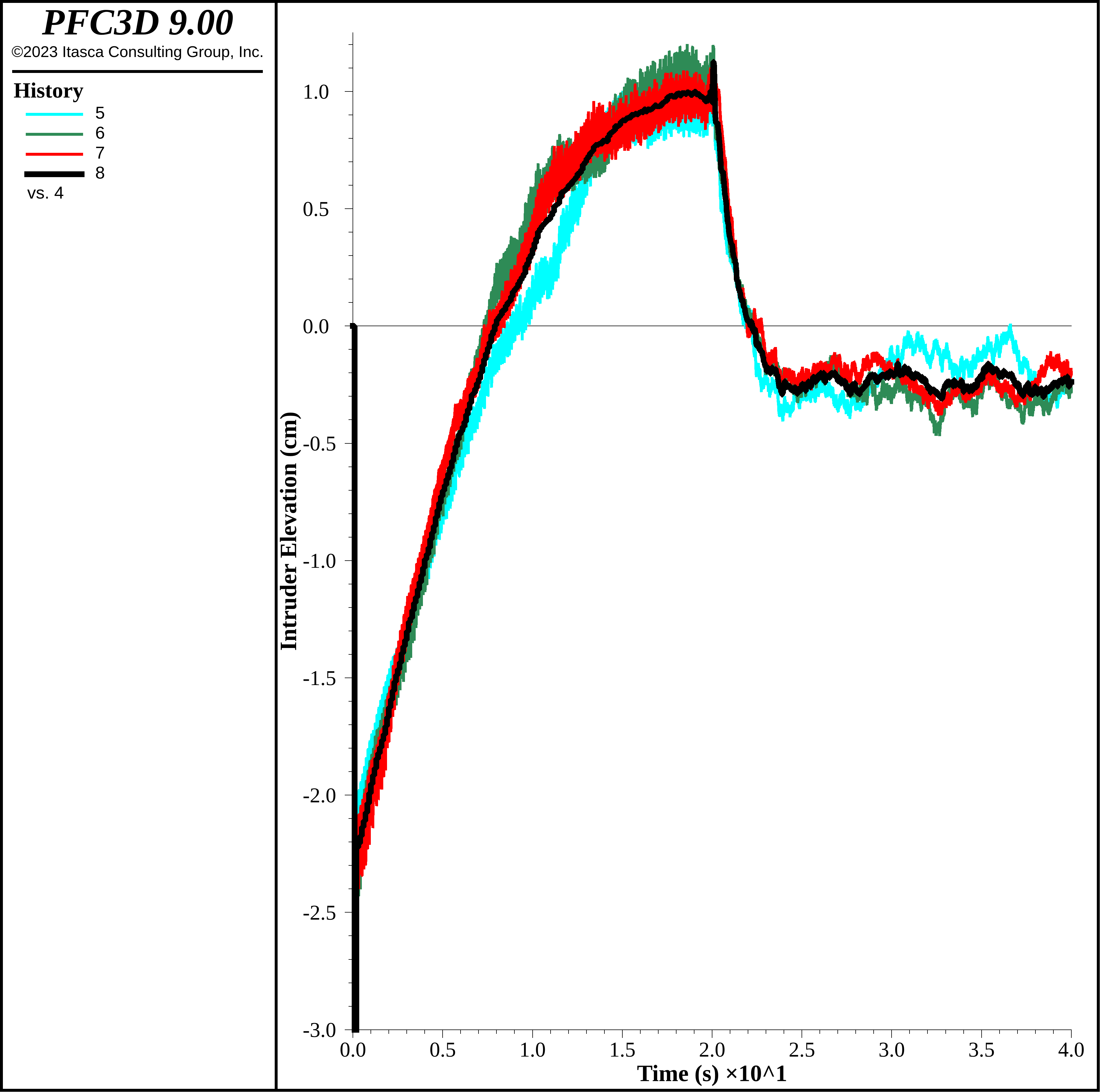 The figure below shows the intruder elevation with changes in the timestep, both fixing it (to values 8e-6 s, 1e-5 s, 1.2e-5 s, 2e-5 s and 3e-5 s) and for changing the timestep safety factor to 0.9 and 1.0 relative to the default settings. The table below shows the run times and number of cycles for each scenario. As can be observed, the model response are relatively insensitive to the timestep schemes up to perhaps 2e-5 s. The 3e-5 s model produced a substantially different response, though. Modifying the safety factor has a moderate impact on run time, on the order of 10%. Choosing a rather large timestep, such as 2e-5 s, can have a much larger impact, though the timestep must be chosen wisely. The model results below present both the automatic scheme and using a timestep of 2e-5.