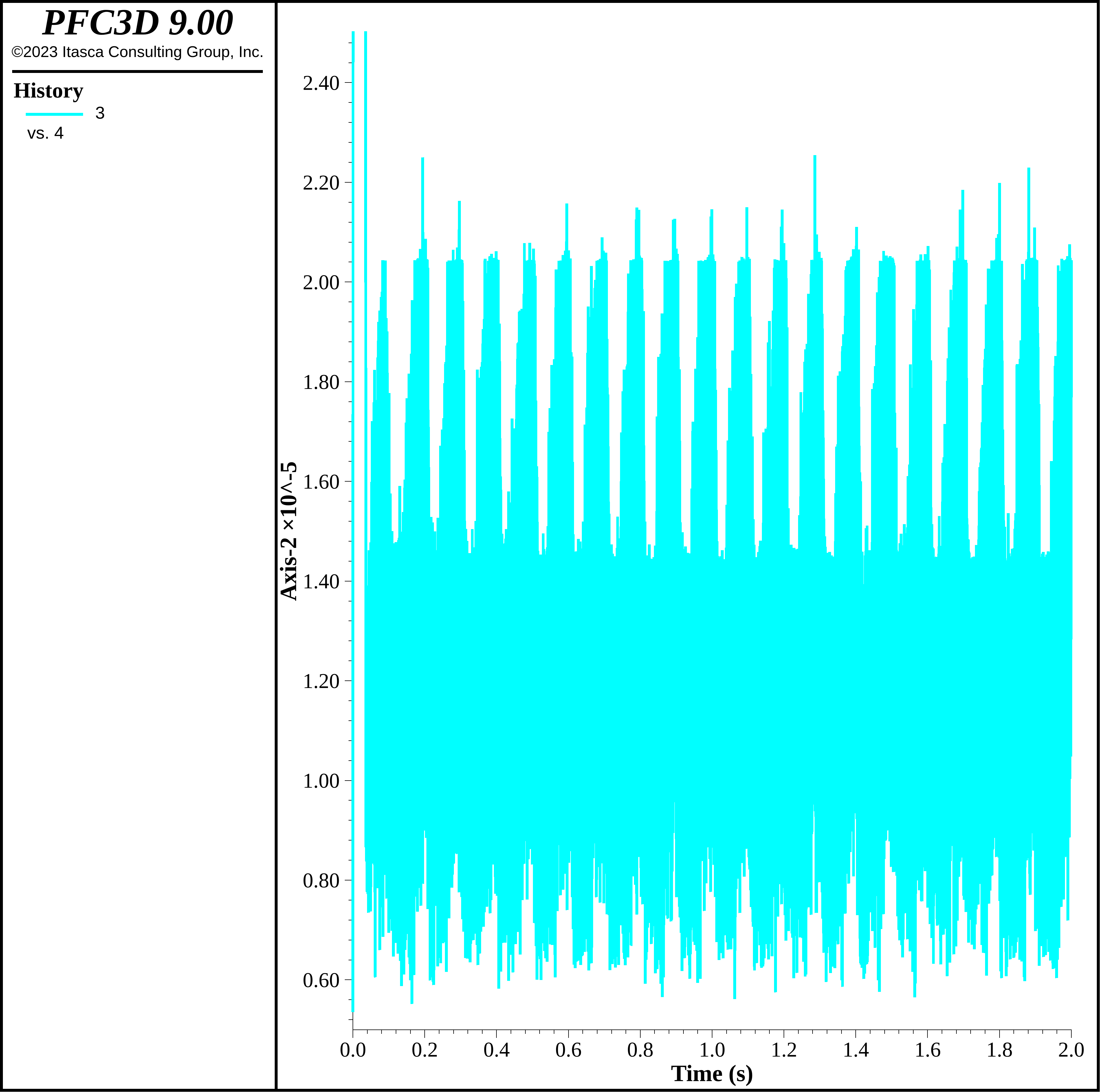 The table below shows the simulation times for each stiffness level for a specific machine with a 10 core CPU in Linux. All plots were closed and other applications as well, in an effort to accurately measure the running times. If timing is sought it is very important to either set the plot interval to a very large value or close all plots, otherwise plotting time may influence the timing results. There are very few balls and contacts in these models, meaning that the CPU is not running at a high percentage all of the time. Timing tests are most informative when tun on larger models. Operating system interruptions may be reflected in the run times below as well. The number of cycles is sensitive to other computational issues such as the contact detection strategy, as discussed below.