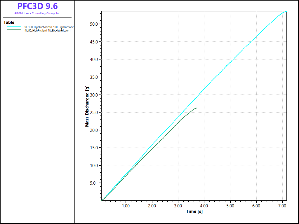 The simulation stops when few balls remain, using the model solve fish-halt command. This allows one to connect a FISH function to the solve logic so that cycling will continue until the specified criteria are met. In order for cycling to cease, the FISH function must return a nonzero value. A value is returned by a FISH function when a value is assigned to the FISH function name. For instance, the statement HaltControl = temp assigns the return value. Once the solve limit has been reached, a table containing the discharged mass as a function of time is exported to a .tab file for further scrutiny (see the table export command).
