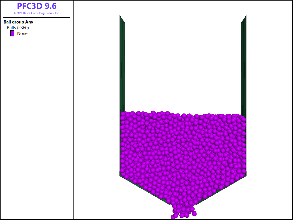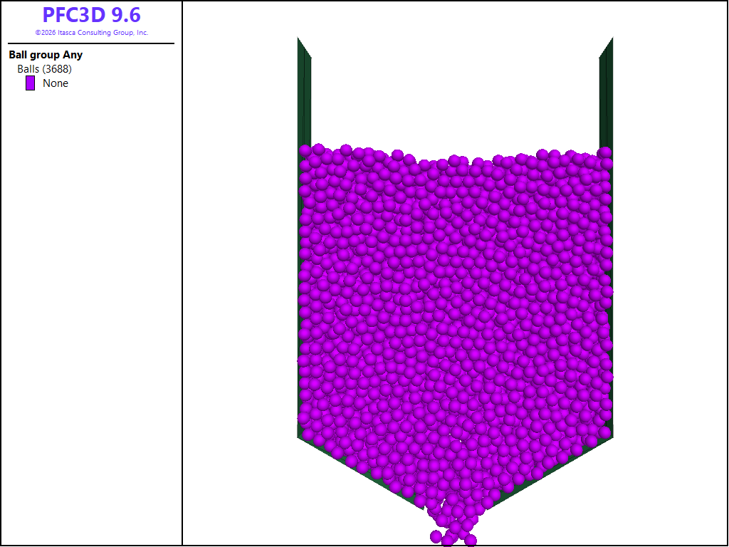 This example demonstrates the use of PFC to model the discharge of spherical particles from a hopper. A simple hopper discharge model is presented in the hopper tutorial. In that case, a cylindrical hopper is utilized. In the present example, periodic boundaries are used to reduce the influence of the hopper geometry. The effects of friction and fill height are investigated via a parametric study; they are shown to have a significant influence on the hopper discharge rate and flow patterns. This example is based on the work from [Anand2008] and [Ketterhagen2009].