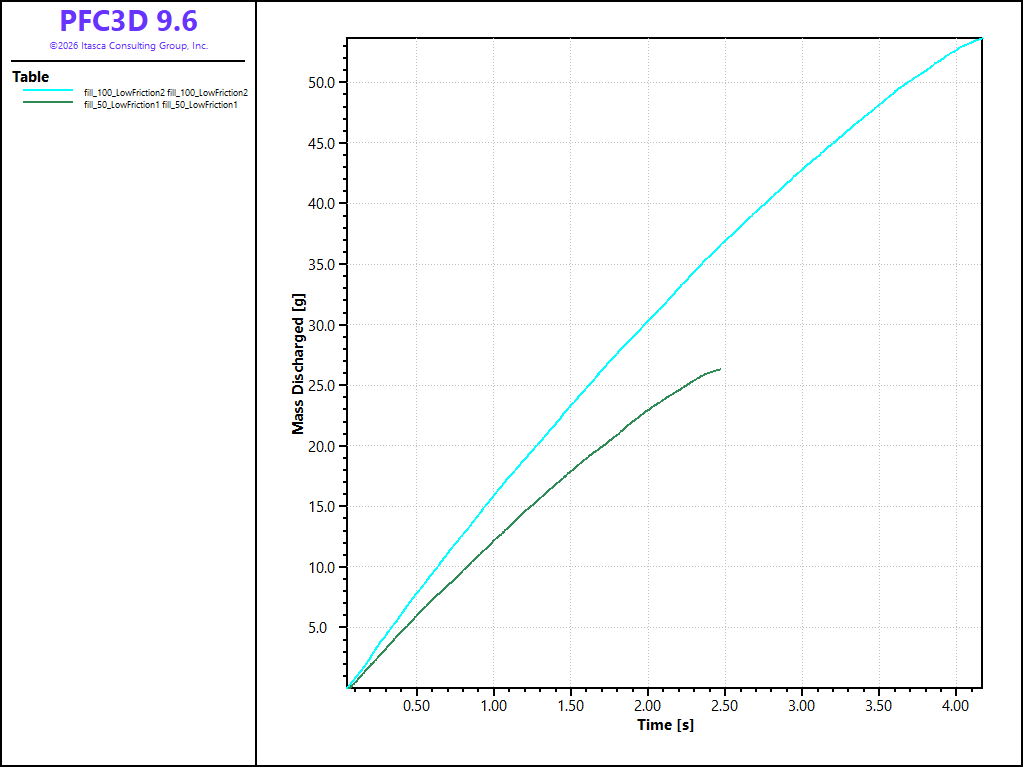 The discharged mass is measured during the simulation via registering a FISH function with a callback event (see the fish callback command). As balls hit the negative \(z\)-domain boundary, they are deleted due to the condition set with the model domain command. The FISH function MeasureDischargedMass is registered with the ball_delete event. Whenever a ball is deleted, this FISH function is executed with the ball pointer provided as the argument. In this way, the mass of each deleted ball can be accumulated. A table is filled containing the discharged mass as a function of mechanical time.