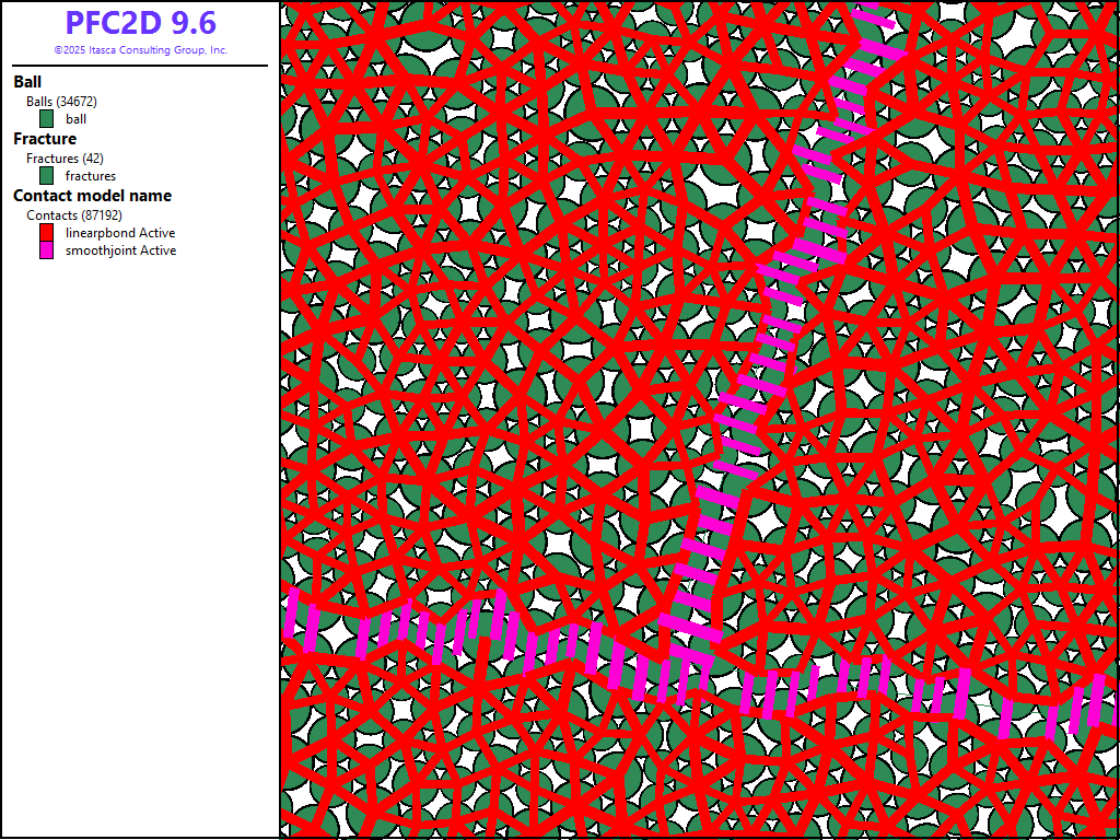 An intact BPM model is created using the linear parallel bond contact model. To build a full-scale model efficiently, the brick logic is employed, whereby a small model is created in periodic space and subsequently assembled into a full-scale model. A DFN is finally generated and used to assign smoothjoint contact models to contacts intercepting fractures. Support for creating bonded-particle models is provided by the Material Modeling Support Package.