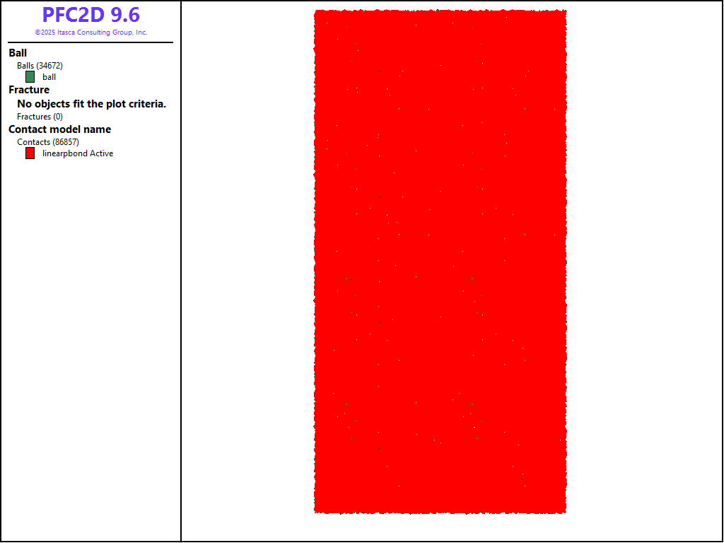 The brick is assembled using the commands in “make_intact.dat (2D)”. In this example, the brick is replicated twice in the horizontal direction and four times in the vertical direction, for a final model size of 8.0 by 16.0 length-units, comprising approximately 35,000 balls. Note that importing the brick does not modify the default slots of the CMAT. As a result, they are modified by assigning the linear parallel bond contact model with lin_mode = 1. This property sets the normal force calculation mode of the linear component to incremental versus absolute. The deformability method is used to set the micro-properties to meet a target Young’s modulus for the linear portion of the contact model. The CMAT is applied so that all contacts are assigned the updated contact model, and the contact forces/moments are nulled. Nulling the contact forces/moments and changing the normal force calculation to incremental mode removes the built-in stresses and may be desirable in certain circumstances. Finally, all contacts between balls that overlap are bonded with the contact method command, and the parallel bond properties are set accordingly. One would likely not want to enter the bond method in the CMAT, since this would result in attempting to bond all subsequently created contacts. Figure 2 shows the intact specimen.