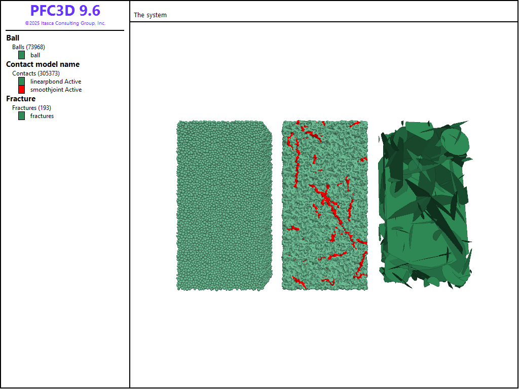 The steps are identical to those in the PFC2D model and are not discussed here. Figure 5 shows the final 3D system with balls (left), parallel-bonds and smoothjoint contacts (middle), and the DFN (right).