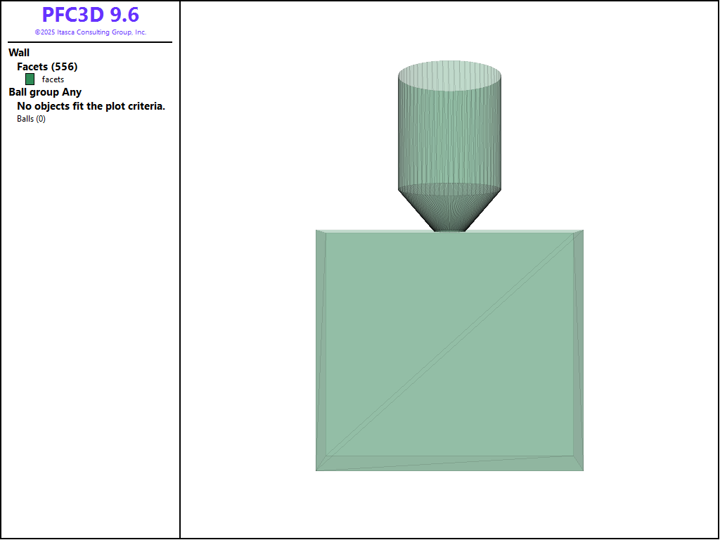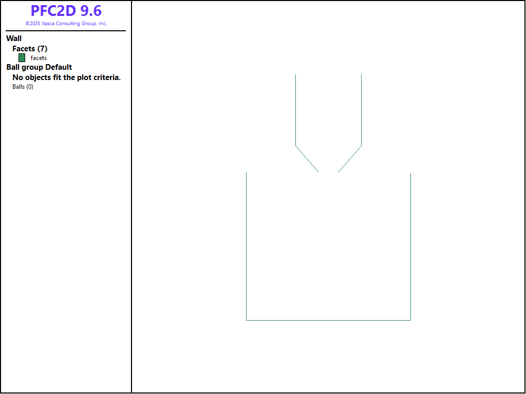 The FISH function geometry specifies the dimensions of the hopper. The domain is created according to those dimensions, and the domain conditions are set to destroy balls that move outside the domain extent (refer to the model domain command for details).