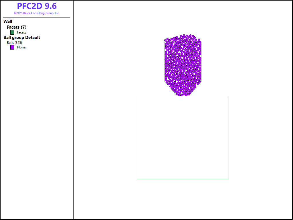 Steps to perform a hopper discharge simulation are presented. The discussion focuses on the PFC3D model but also applies to PFC2D. Figures of both models are shown. This tutorial remains intentionally simple; a more advanced example is discussed in the hopper flow example application, where the influence of filling height and friction on the discharge rate are investigated.
