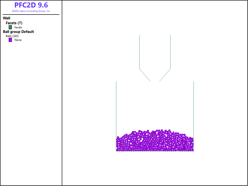 This tutorial demonstrates the creation of a simple hopper geometry with the wall generate command. This command can generate several simple wall geometries. The hopper is filled and the balls are equilibrated using the model mechanical timestep scale command. Groups are subsequently defined and the balls are allowed to flow from the hopper. The post-processing visualization of dynamic problems like this one can be greatly facilitated by the result logic for balls (ball results), clumps (clump results), and walls (wall results).