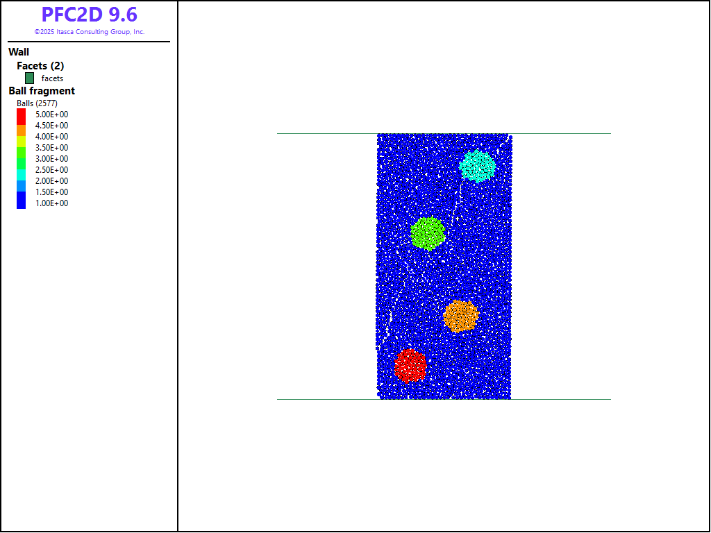 An unconfined compression test is performed on a bonded-particle model (BPM) with uniform mechanical properties. Select regions of the sample (inclusions) are given smaller or larger stiffness parameters, and the test is repeated. This tutorial demonstrates advanced usage of the Contact Model Assignment Table (CMAT) to build complex materials with a spatial distribution of mechanical properties. The linear and linear parallel bond contact models are used. The Material Modeling Support Package can also be used to create and test BPMs; however, it would need to be modified to add the inclusions.