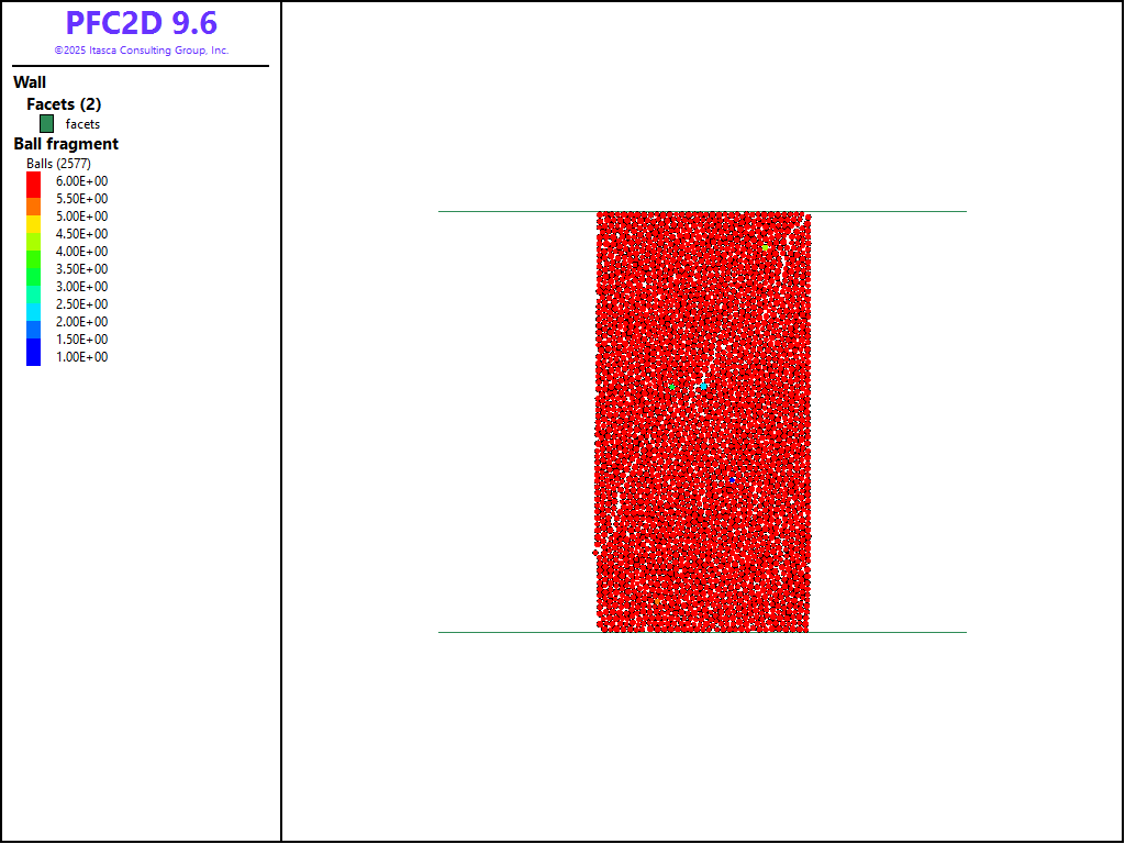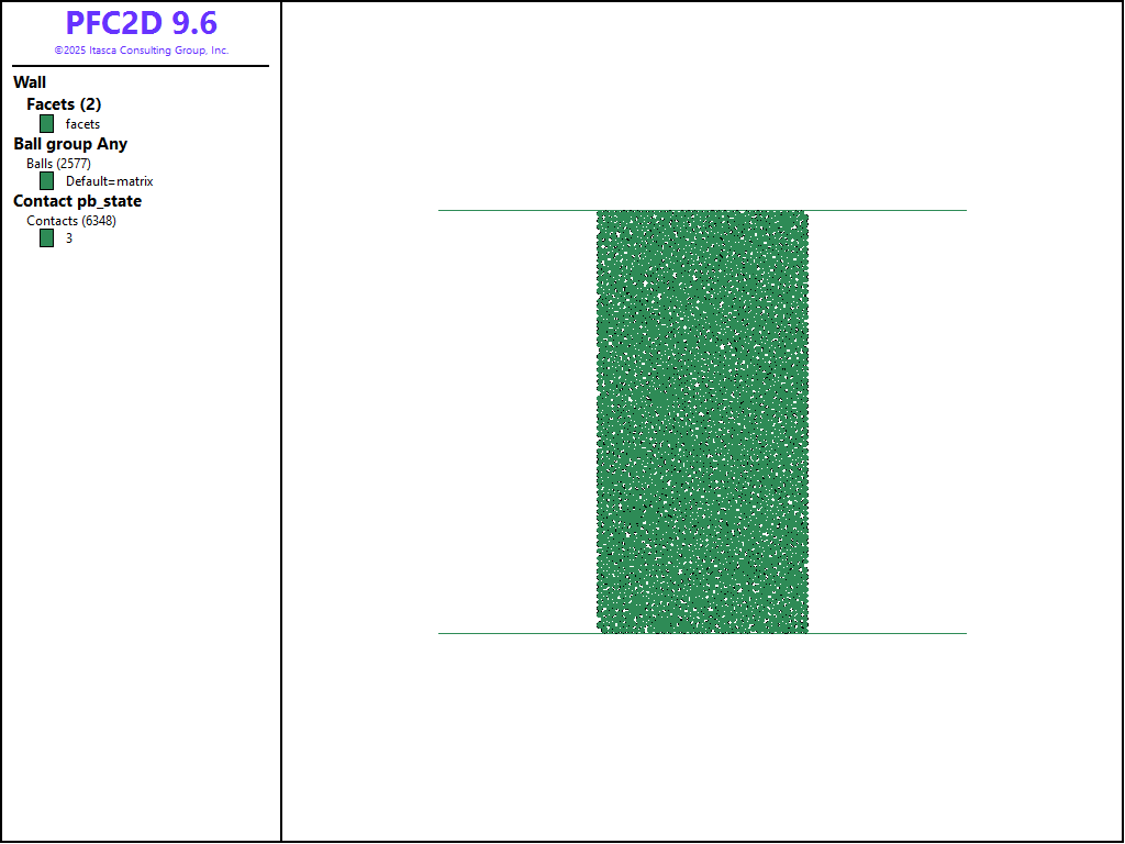 The complete data file (2D) for this example is “inclusions.dat (2D)”. Select lines of this file are discussed below. The initial stage of constructing the bonded-particle specimen is not discussed since the procedure is similar to the one presented in the “Generating a Bonded Assembly” tutorial. Note that balls have been created with the ball distribute command and have all been assigned the matrix group identifier.