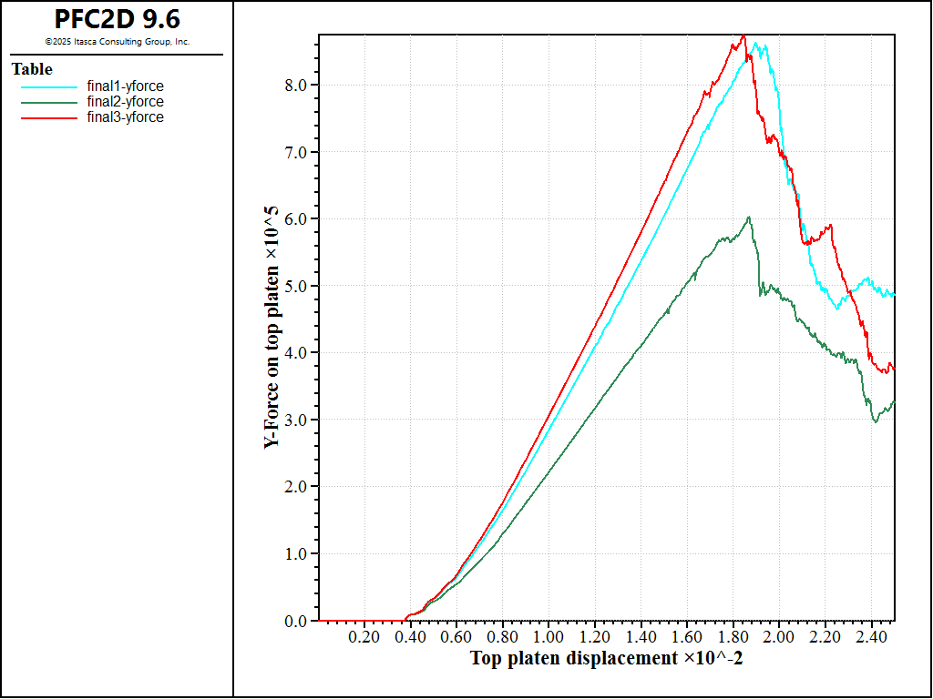 For all three cases, Figure 6 shows the evolution of the \(y\)-component of the resultants of the contact forces acting on the top platen versus the platen \(y\)-displacement. The soft inclusions significantly decrease the yield strength of the BPM, along with the post-peak response. The stiff inclusions, on the other hand, have little impact on these responses.