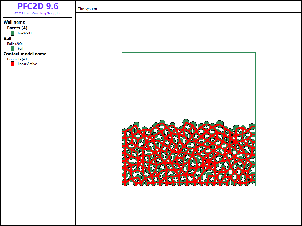 The data file “cmat6.dat” constructs a dense assembly of balls in a container (using a linear contact model for all contact types), then uses the contact model command to install a linear parallel-bond contact model at ball-ball contacts and the contact property to modify properties of those contacts.