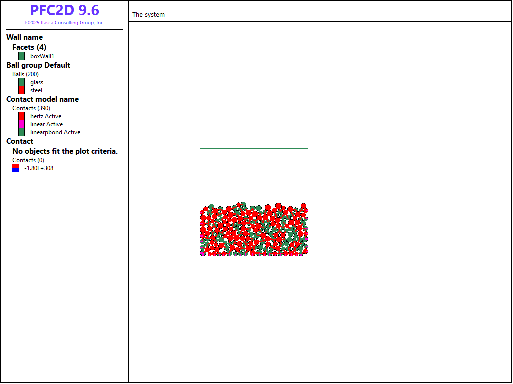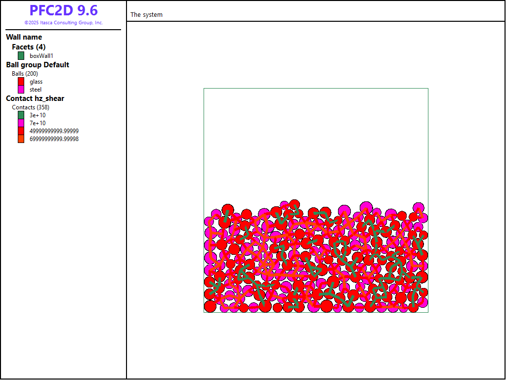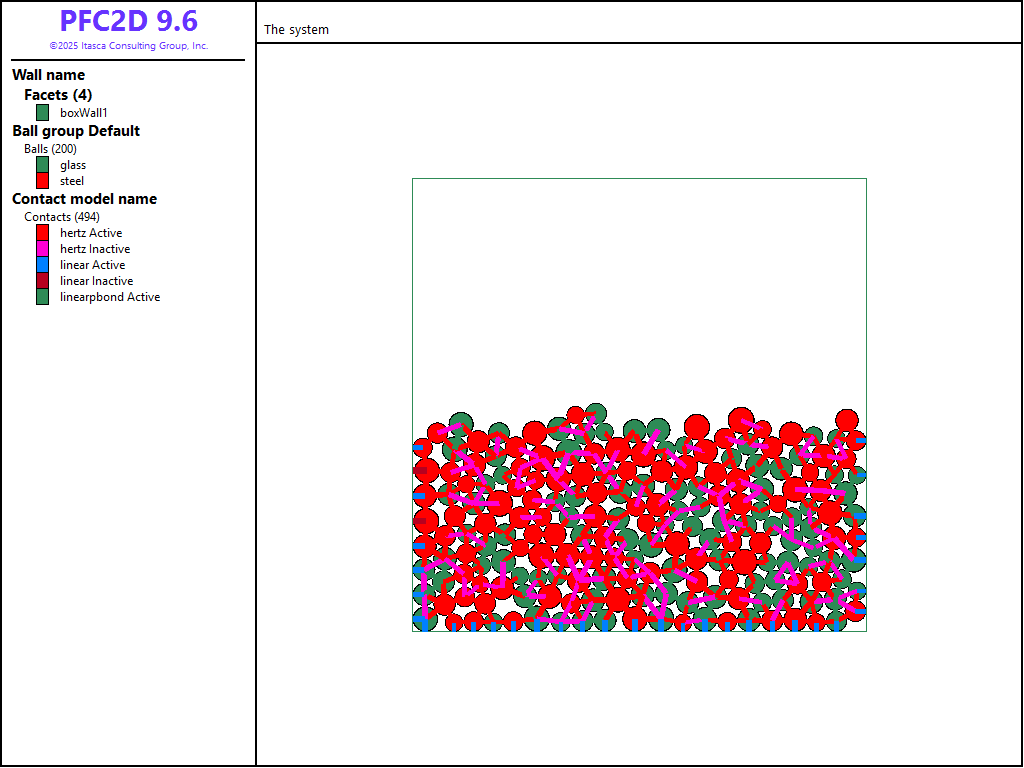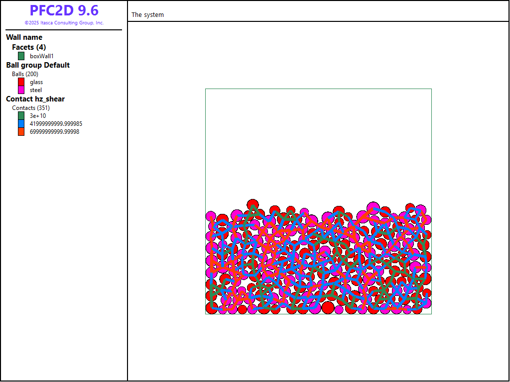 The final state of the system is shown in Figure 7. Active contacts between glass balls have been assigned a linear parallel-bond model, bonds have been installed, and the system brought to equilibrium under gravity. All contacts (active and inactive) are displayed and colored by the name of their contact model. In this system, inactive contacts and new contacts between glass balls will use the appropriate hertz contact model (as defined in the corresponding slot of the CMAT).