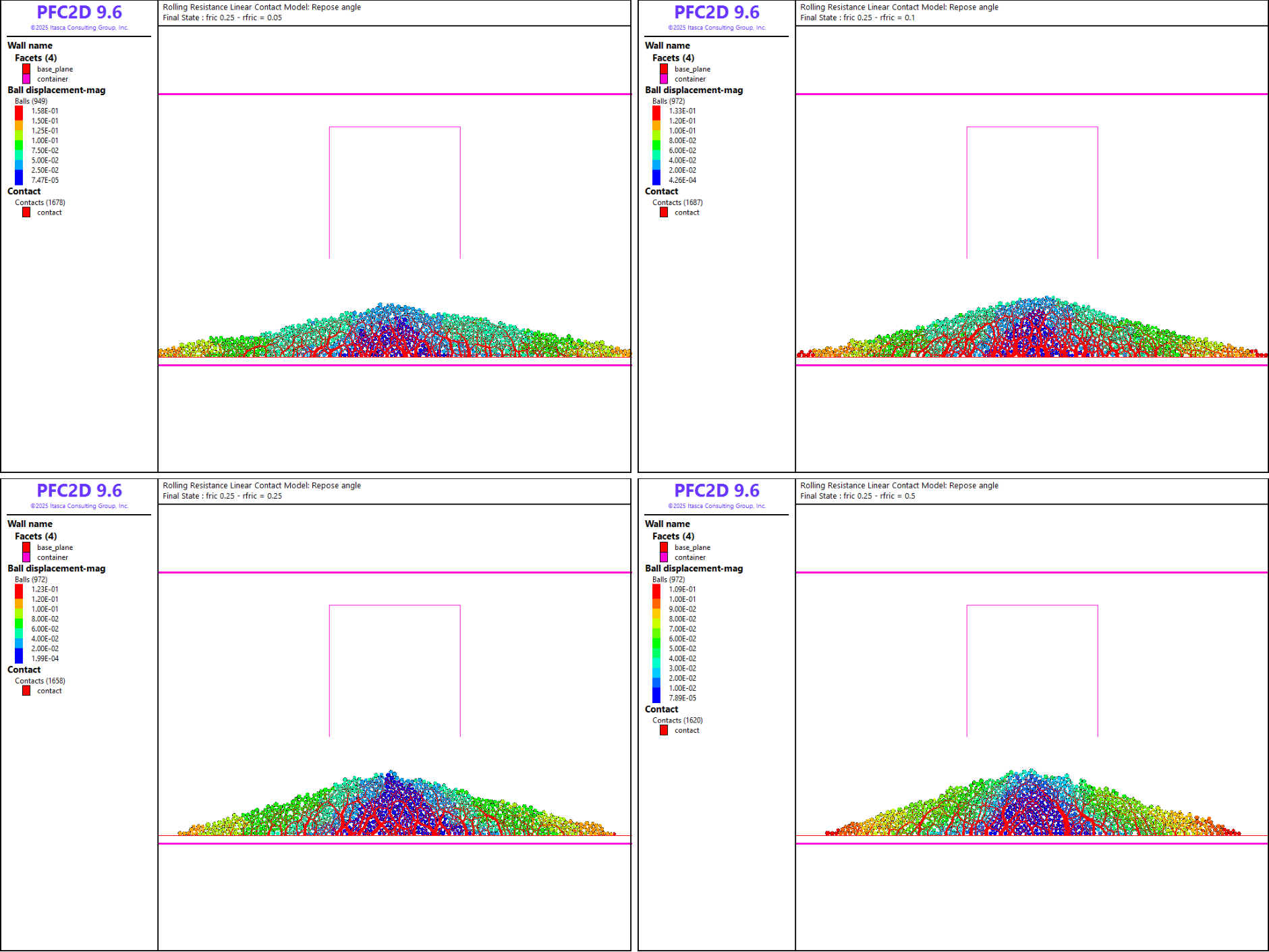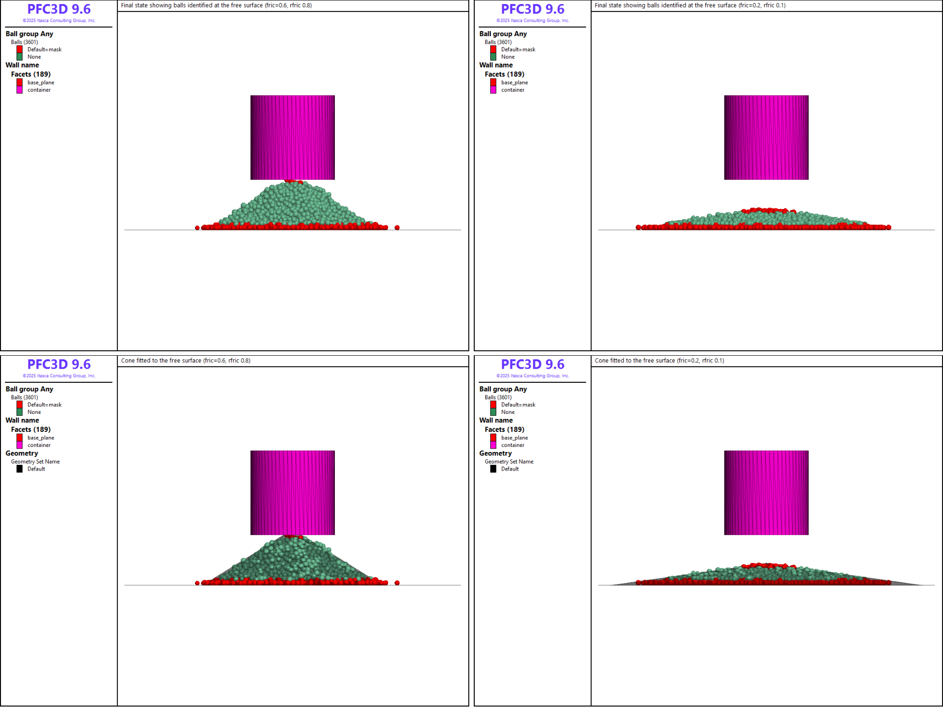 In this example, a granular heap is formed by lifting a container initially filled with balls at rest under gravity. The rolling resistance linear contact model is used, and the simulation is performed several times with varying values of the friction and rolling resistance coefficients to investigate their effect on the final shape of the heap. This example is addressed in PFC2D and PFC3D. Usage of Python scripts to perform batch jobs is demonstrated. In the 3D example, an automated procedure that uses Python scripts to estimate the repose angle of the final heap is proposed.
