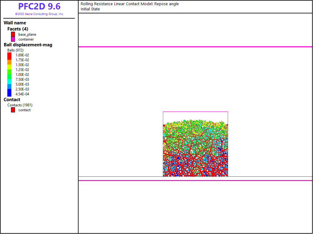 Please refer to the rolling resistance linear contact model section for a detailed description of these properties. Note that at this stage a very low value of the friction coefficient is used, and the rolling resistance coefficient is set to zero. These values are used to produce a relatively dense final state. Also note that the contact Young’s modulus is set to 1MPa (using the contact model’s deformability method). This value is sufficient to ensure that the system remains within the rigid grain limit (i.e. the ratio between the contact Young’s modulus and the maximal stress at the bottom of the column is large enough, or inversely the magnitude of the overlaps are small compared to the contacting ball diameters, so that increasing further the contact stiffness would not affect the results) while optimizing the estimated timestep.
