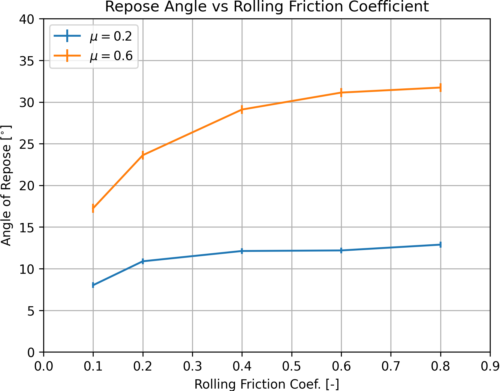 The influence of the friction and rolling friction coefficients can be qualitatively discussed from these two figures. At a constant coefficient of friction, the repose angle of the heap increases with increasing value of the rolling friction coefficient. However this increase seems to plateau if the rolling friction coefficient is equal or greater than the friction coefficient (see for instance the bottom figures in Fig. 2). Similarly, at constant rolling friction coefficient, the angle of repose also increases with increasing friction coefficient.