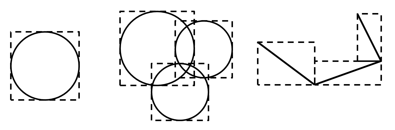Figure 1: Minimum extents for a ball (left), pebbles of a clump (center) and facets of a wall (right).