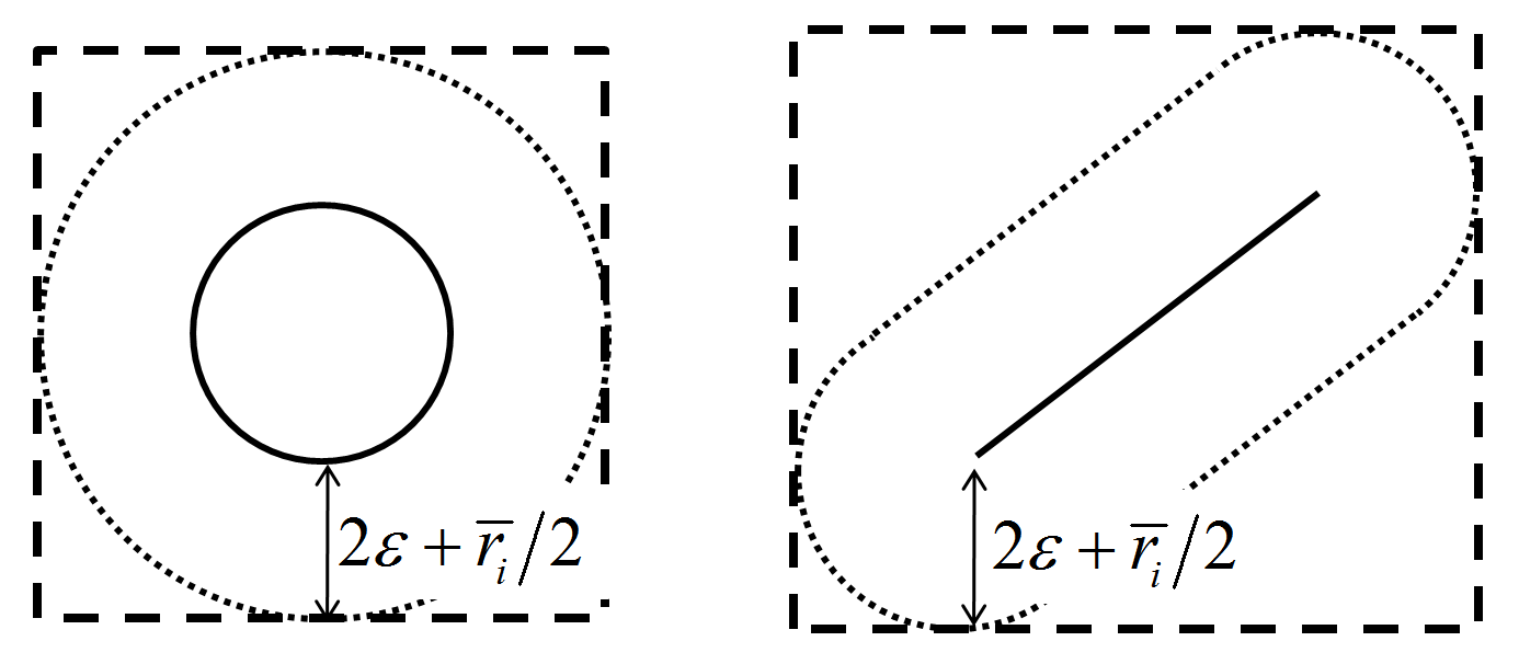 Figure 2: Cell extents for a ball/pebble and a facet. \(\varepsilon\) is the tolerance, and \(\overline{r}_i\) is the maximum interaction distance.