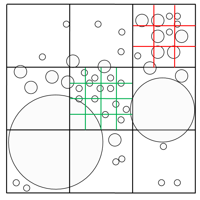 Figure 4: Parent cells are locally refined into children to match a target number of objects in the cell.