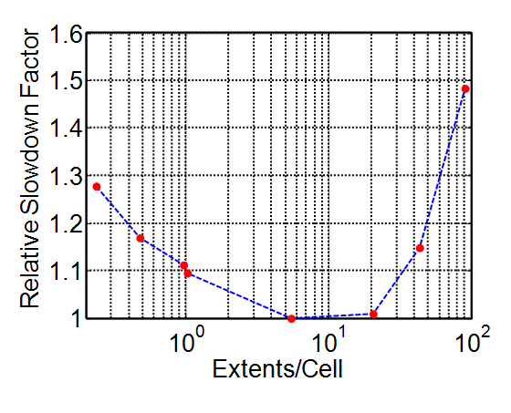 [Mio2007] demonstrated an alternate linked-cell implementation with optimal performance when the number of objects mapped per cell is approximately 1 to 5. The figure below presents the relative performance of the PFC spatial-search implementation described above without refinement; these results are used to guide the cell-refinement algorithm. Approximately 11,000 uniform balls in 3D are generated in a cubical region such that they do not overlap (generated with 100,000 tries). These balls are subsequently enlarged by a factor of 1.5. Gravity is disabled, an initial velocity is supplied to the balls, and the model is cycled for 250 cycles. The extents are enlarged in each direction by 25% of the ball radius. The model domain is set such that ~120,000 ball extents fit within the model domain without overlap. The reported relative slowdown factors are based on the remapping and contact detection times summed while cycling. This measure of performance is referred to as the detection time, where reported values are always averaged over two runs. Optimal schemes have relative slowdown factors of 1 while larger values convey longer detection times. It is evident that 5-20 piece extents per cell are optimal with little performance sensitivity within this range.