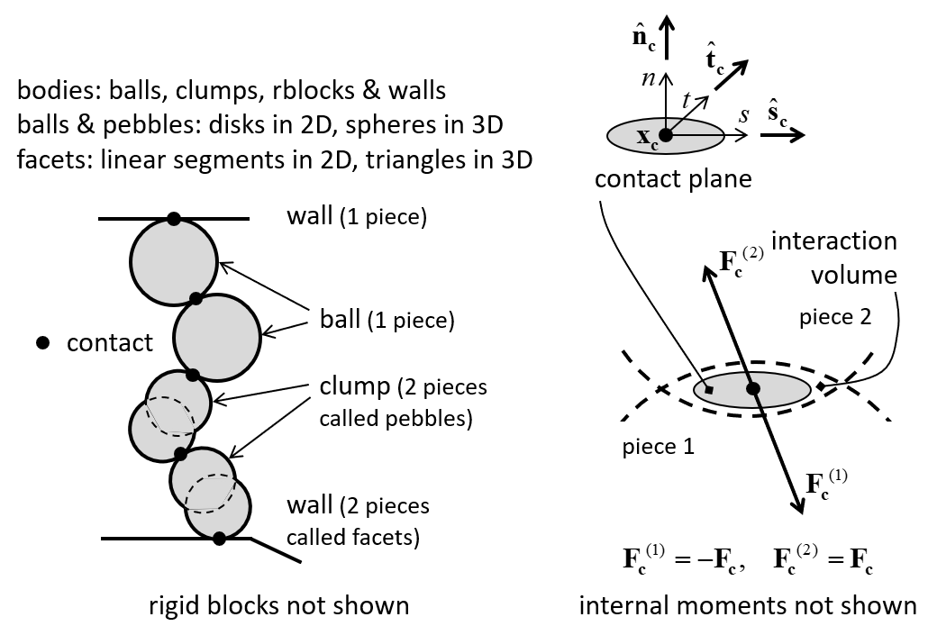 A PFC model simulates the movement of particles and walls and their physical interaction at pair-wise contacts. We denote each particle as a body to clarify that it is not a point mass, but a rigid body with finite mass and well-defined surface. The PFC model consists of bodies, pieces, and contacts (see Figure 1). There are four types of bodies: balls, clumps, rigid blocks, and walls. Bodies have surface properties that are assigned to the pieces on the body surface. A ball consists of one piece, which is the ball itself, while the pieces of a clump and wall are called pebbles and facets, respectively. A rigid block consists of one piece, which is the rigid block itself. A ball is a rigid unit-thickness disk in 2D and rigid sphere in 3D. A clump is a collection of pebbles that are rigid unit-thickness disks in 2D and rigid spheres in 3D. Clumps model arbitrarily shaped rigid bodies. The pebbles comprising a clump can overlap but contacts do not exist between them; instead, contacts form between the pebbles on the boundary of a clump and the pieces of other bodies. A rigid block is a rigid unit-thickness polygon in 2D and rigid polyhedron in 3D. A wall is a collection of facets that are rigid unit-thickness segments in 2D and rigid triangles in 3D and that form a manifold and orientable surface. Bodies may have surface properties that can be assigned to each piece on the body surface; these surface properties may be used to determine the piece interactions. Bodies exist within the model domain and cannot move outside of this region.
