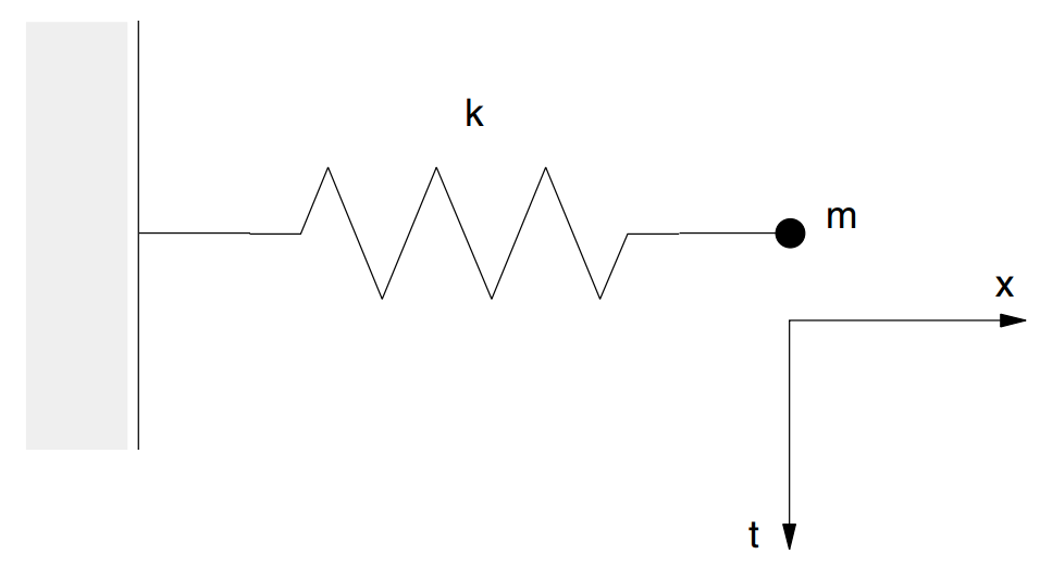 First, consider a one-dimensional mass-spring system described by a point mass \(m\), and spring with stiffness \(k\), with the coordinate system shown in Figure 1. The motion of the point mass is governed by the differential equation \(-kx = m \ddot x\). The critical timestep corresponding to a second-order finite-difference scheme for this equation is given by Bathe and Wilson ([Bathe1976]):