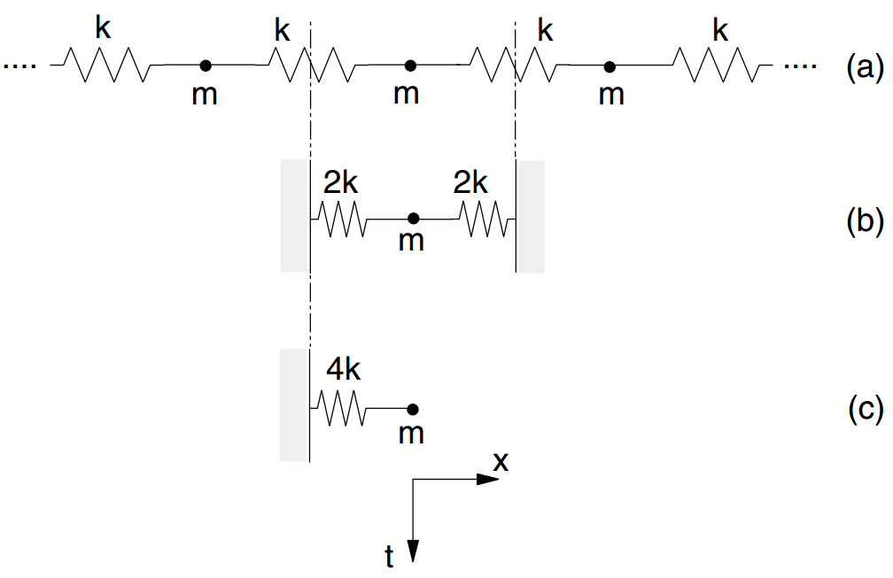 Next, consider the infinite series of point masses and springs in Figure 2. The smallest period of this system will occur when the masses are moving in synchronized opposing motion such that there is no motion at the center of each spring. The motion of a single point mass can be described by the two equivalent systems shown in that figure. Using Equation (9), the critical timestep for this system is found to be
