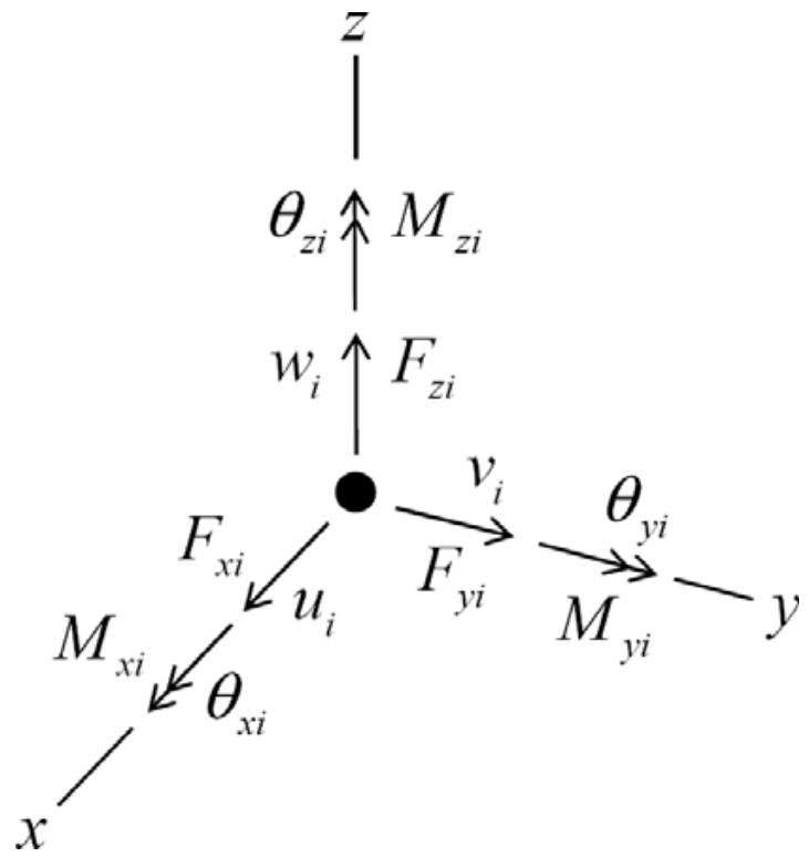 Each contact exists between two discrete pieces, each of which has six degrees of freedom at its center of mass of the body in 3D. If we refer to the centers of mass as nodes, then we can say that each contact has a stiffness matrix that relates generalized forces and displacements at the two nodes that it joins. The nodal degrees of freedom contain three translational components and three rotational components. The generalized displacements and forces at node \(i\) are denoted by