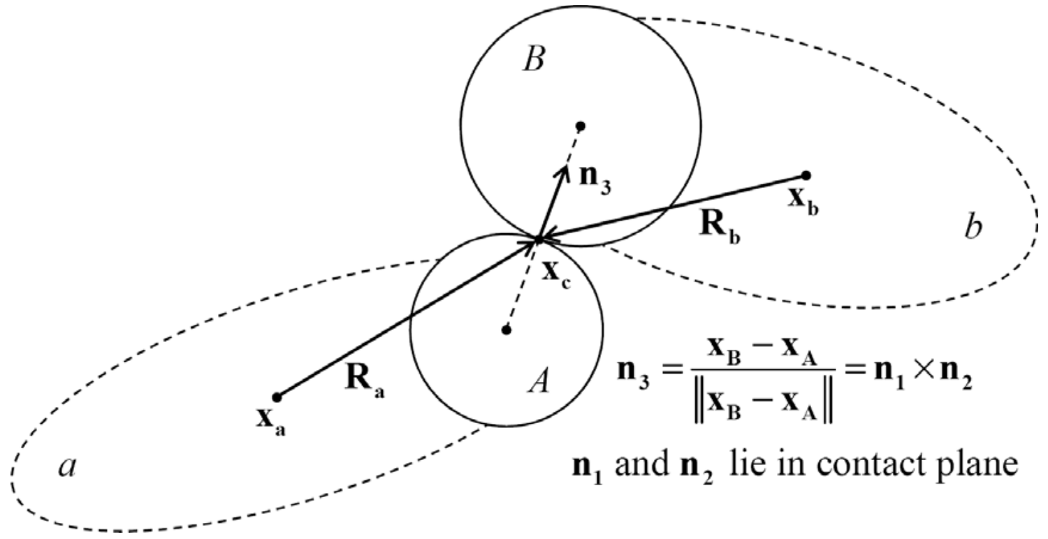 A typical contact joining two pebbles of separate clumps is shown in Figure 4. The system is defined by the centers of mass of clumps \(a\) and \(b\) (\(\bf x_a\) and \(\bf x_b\), respectively), the contact location (\(\bf x_c\)), a unit-vector triad (\(\bf n1\), \(\bf n2\) and \(\bf n3\)) such that \(\bf n_3\) is aligned with the contact-normal direction, and the contact translational (\(k_n\) and \(k_s\)) and rotational (\(k_{n \theta}\) and \(k_{s \theta}\)) stiffnesses. We also define \(\bf R_a = x_c - x_a\) and \(\bf R_b = x_c - x_b\).