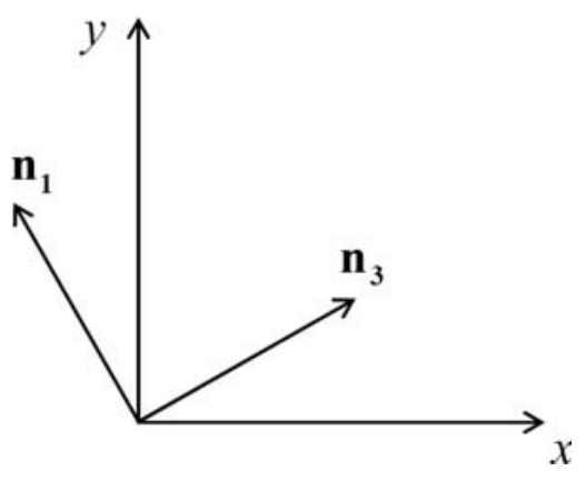 We align the unit-vector triad such that \(\bf{n_1}\) and \(\bf{n_3}\) lie in the global xy-plane, and choose \(\bf{n_1}\) such that \(\bf{n_3} \times \bf{n_1} = + \bf{\hat{j}} = \bf{n_2}\). The system is shown in the figure below and has the form