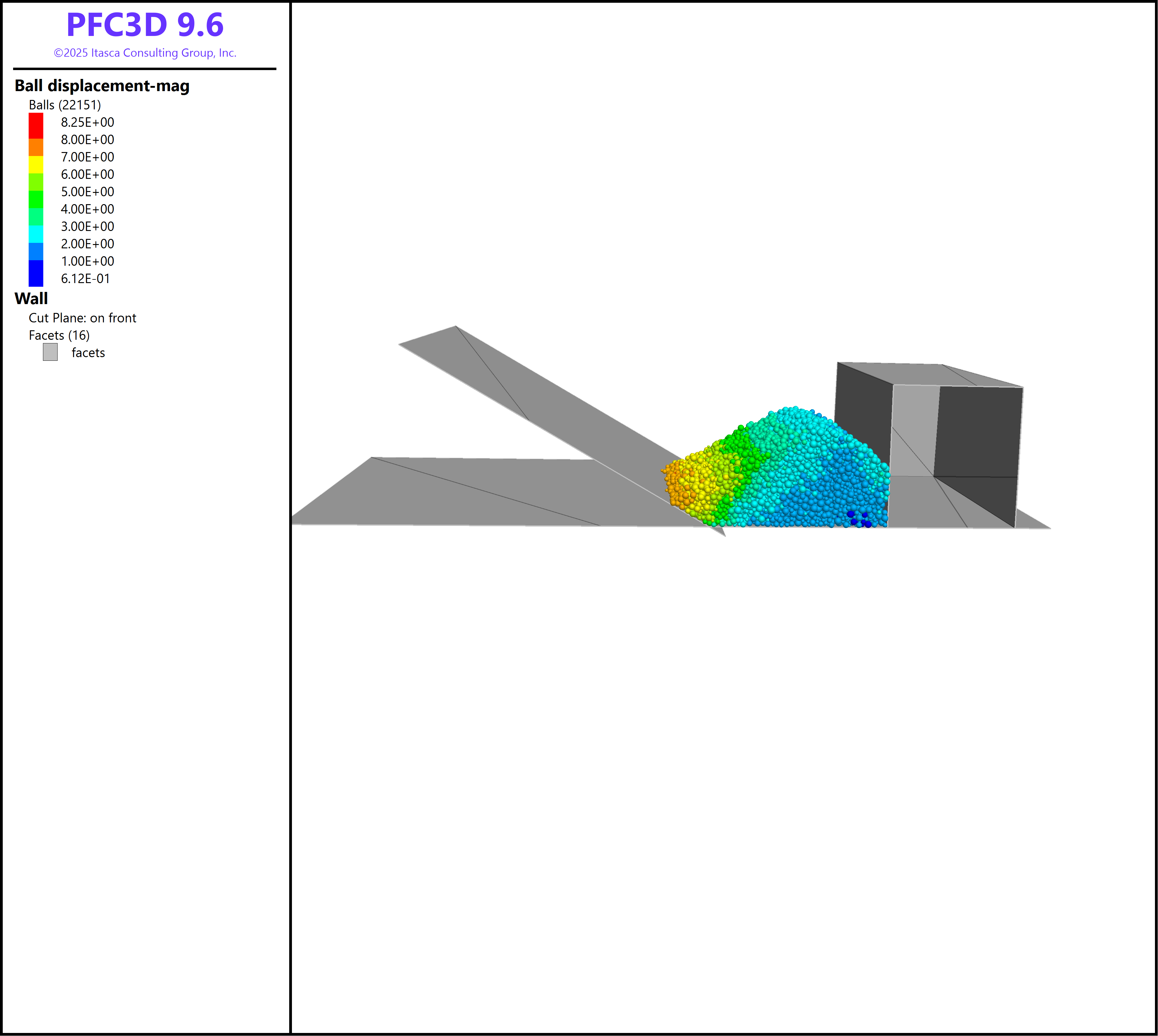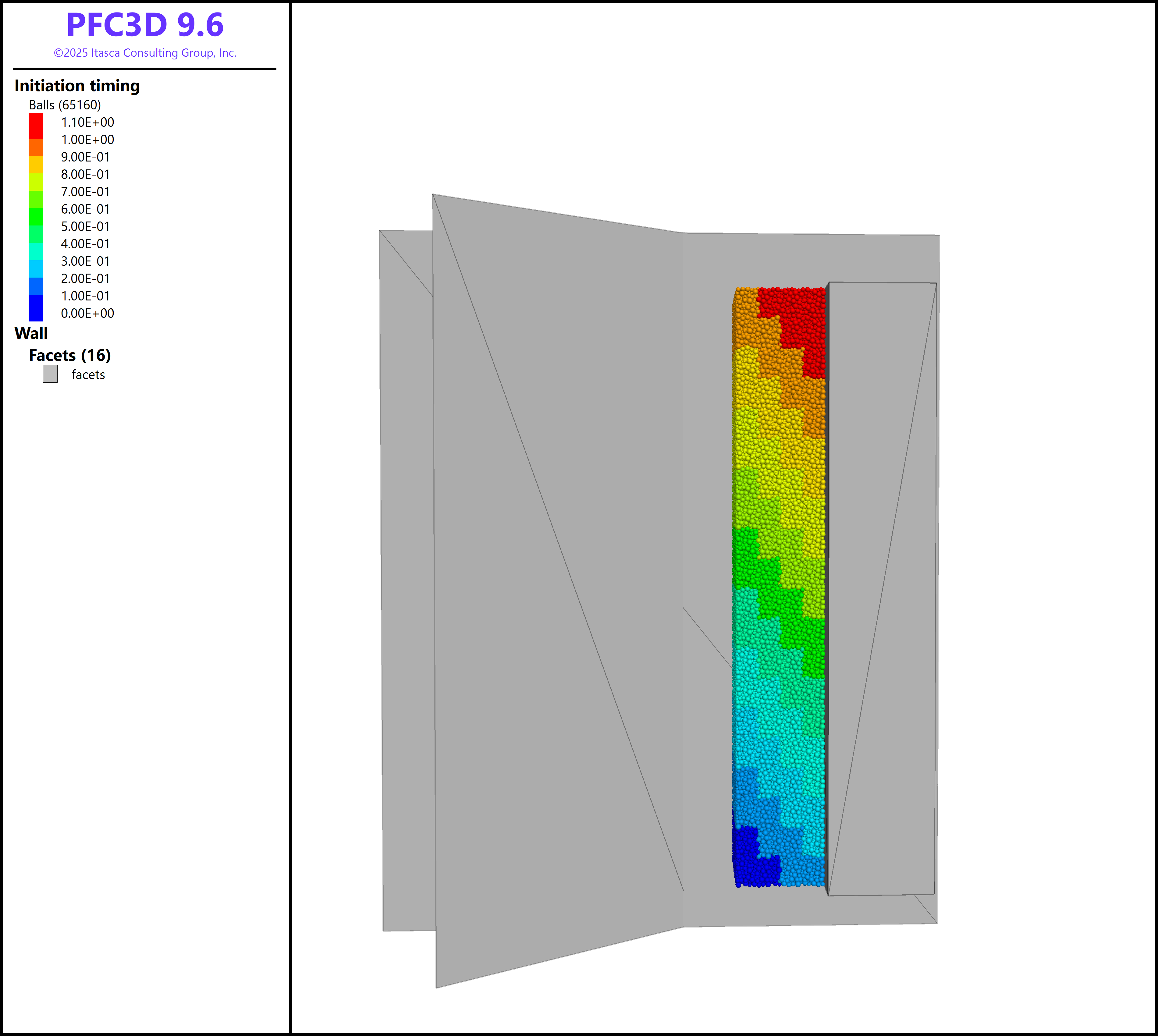 Predicting and optimizing rock movement during blasting is important to prevent unnecessary material handling, reduce ore loss and dilution, to improve safety, and to the minimize environmental footprint. This example demonstrates the use of PFC3D to model the rock blasting throw and the muckpile formation. In this model, the horizontal velocity imparted on the burden by the blast is prescribed as 4 m/s. The model begins after the rock has been fragmented and the vector direction of rock movement is set according to the inter-hole and inter-row timing pattern. Particles are fixed in place with zero velocity until the blasthole near a particle goes off and movement begins. Particles are freed and given an initial horizontal and small positive vertical component. The horizontal velocity components are determined by the local angle of the hole timing contours, in this case after the first hole all subsequent holes are initiated to move at a 45 degree angle in the +ve X +ve Y direction (North-east).