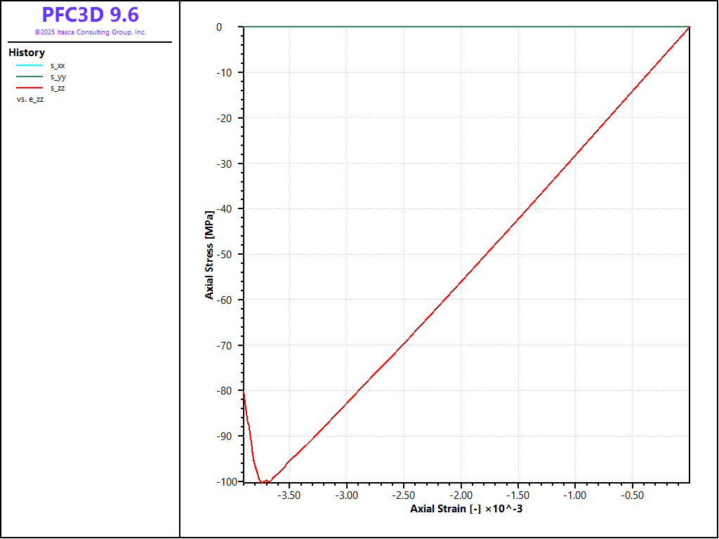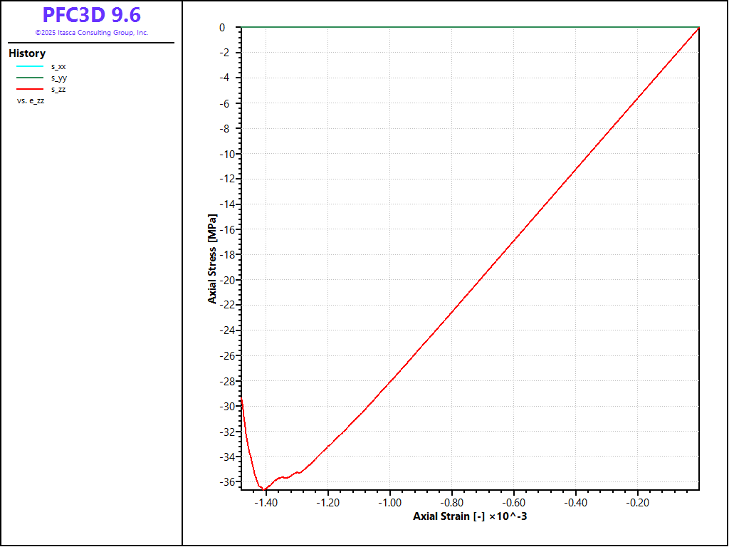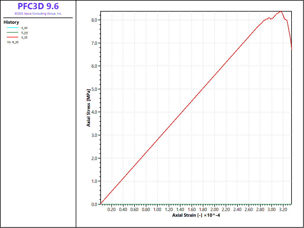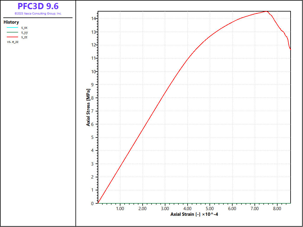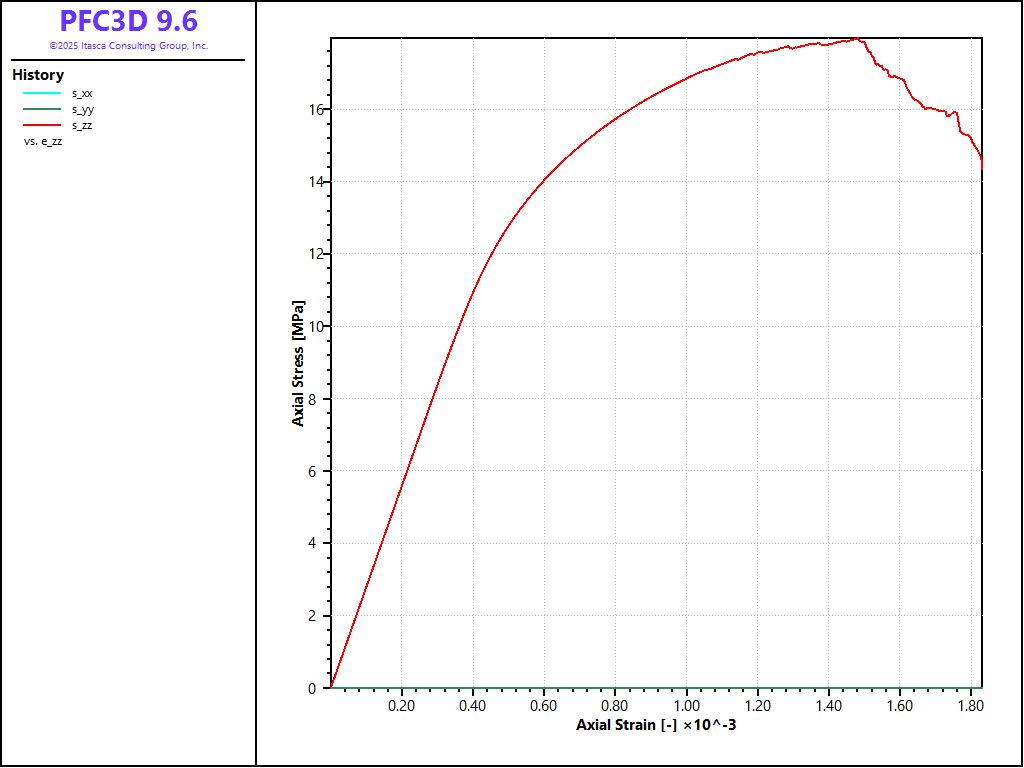 The files discussed above demonstrate an effective set of procedures that can be used to generate a bonded-particle model, and perform direct-tension, unconfined compression and confined compression tests. In this example, the soft-bond contact model is used. The results shown above all use a set of parameters that forbid softening, and the resulting behavior has been shown to be that of a brittle material, with a compressive-to-tensile strength ratio of about 4.0, which is the value typically obtained with linear parallel-bonded materials, but is typically much low than the ratio most rocks exhibit.
