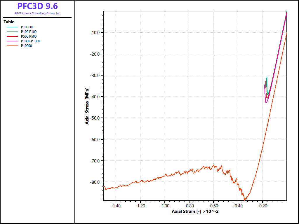 A third set of tests is performed by executing the file doall_A10_S20_C0_COH1000.dat. In this case, softening is activated by setting a value of 20.0 for the softening factor, a value of 0.0 for the tensile strength softening factor, and the bond cohesion is increased to forbid shear failure.
