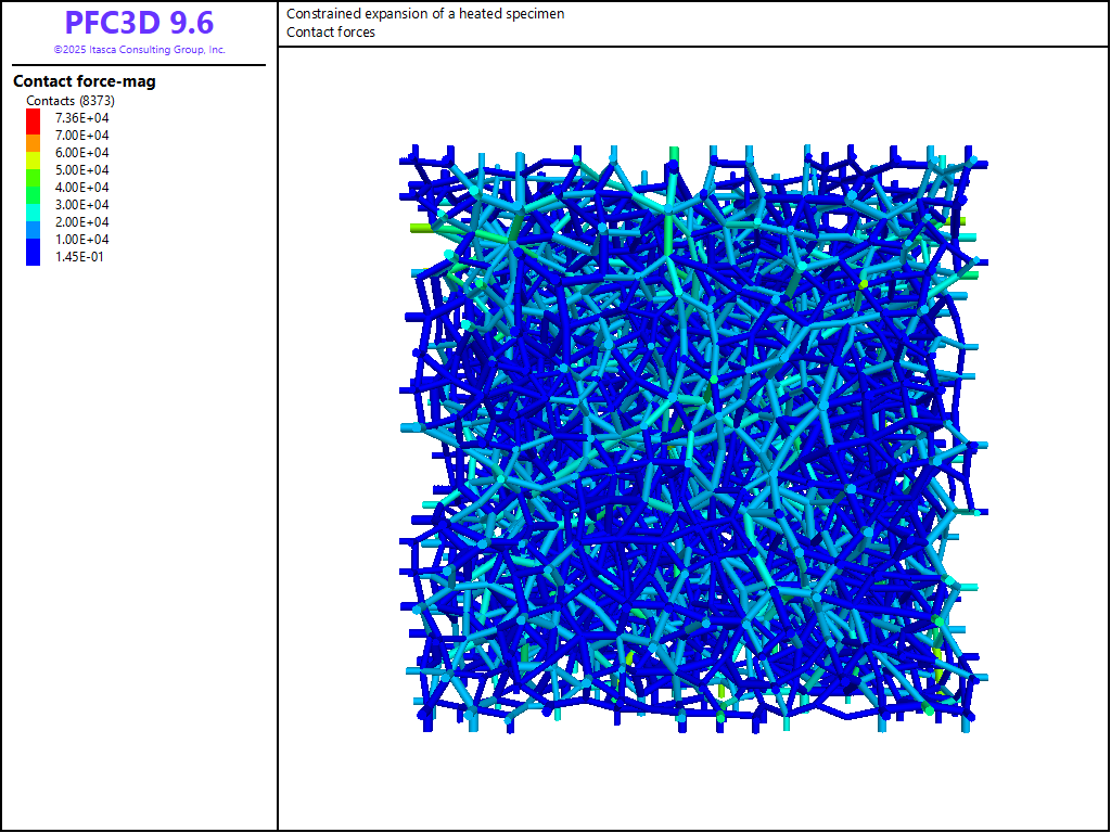 The file “constrained_expansion.dat” is used for this example. A 2 × 2 × 2 m specimen is created. It comprises approximately 4000 balls with uniform size distribution (radius range from 0.05 to 0.08 m) and a porosity of 0.38. Once the specimen is generated and equilibrated under an isotropic stress state of 100kPa, contact bonds are installed at ball-ball contacts.