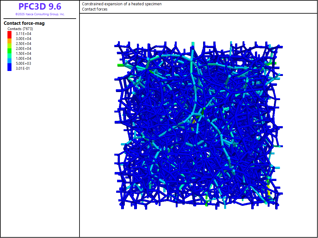 The stress and strains are measured using a measurement sphere with a radius of 0.95 m centered within the specimen, and the stresses are also measured on the boundary walls. In PFC, the particle thermal-expansion coefficient is the same as the coefficient of linear thermal expansion: \(\alpha_t\) = 3 × 10-6/°C in this case.