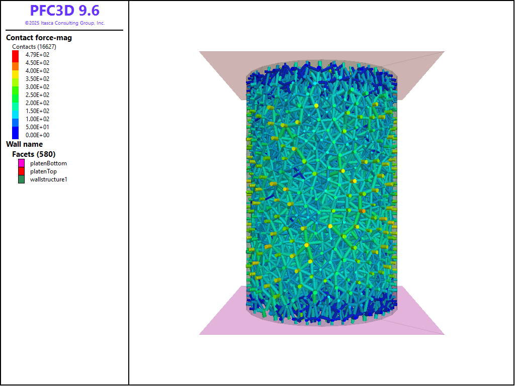 This example demonstrates the use of shell-based structural elements to perform a set of sleeved triaxial tests on a bonded-particle model (BPM). A model of this nature could be investigated using PFC alone. However, in that case, a fair amount of FISH would be required for the sleeved wall to mimic the behavior of an elastic membrane. Here, a sleeve is created from a shell and a BPM is synthesized inside the sleeve as seen in Figure 1. As described in detail in the Wall-Zone Coupling Scheme section, PFC walls are slaved to shell-based structural element. Contacts exist between PFC balls and wall facets; the contact forces and moments at each ball-facet contact are used to determine an equivalent force system to apply to the corresponding shell nodes. In this model, the specimen is created with no initial stress for simplicity and the platens are displaced with a constant velocity. Using this example as a basis, one could easily define the failure envelope of a BPM.