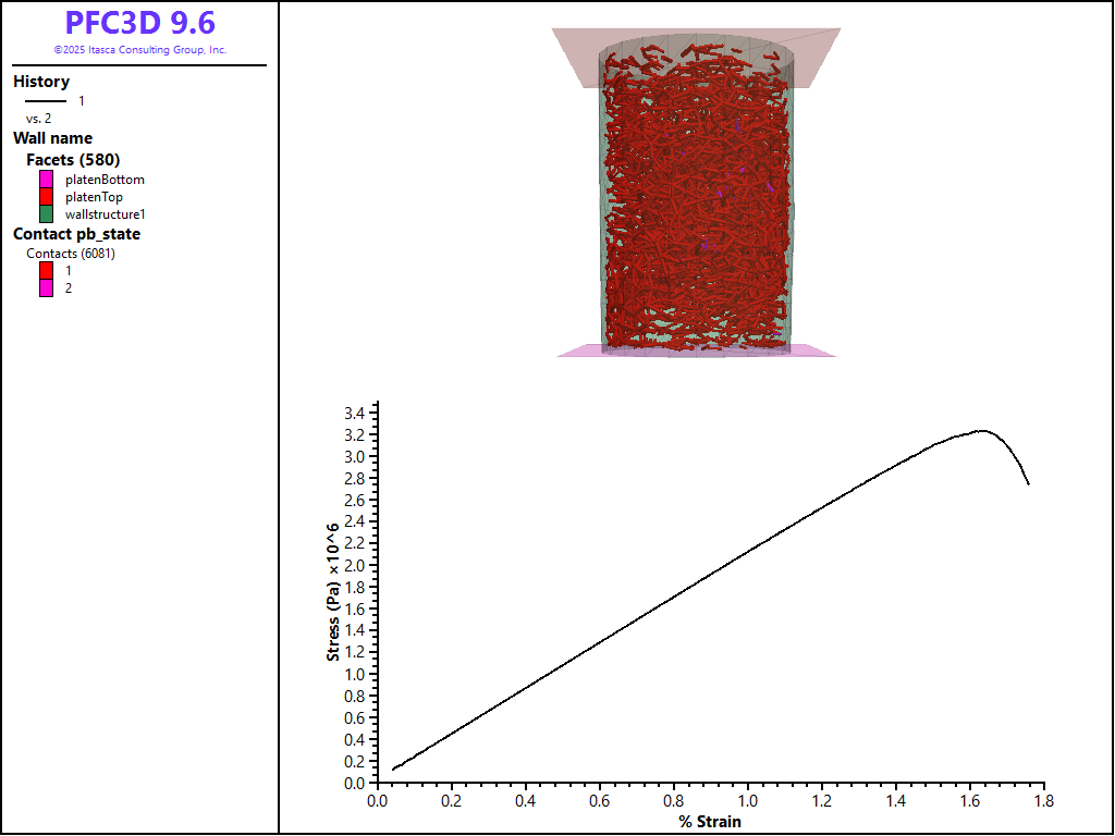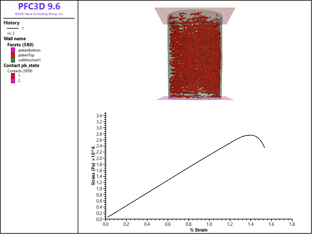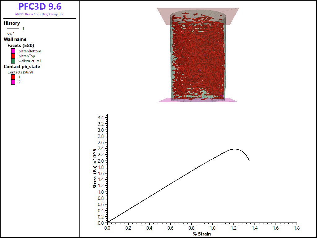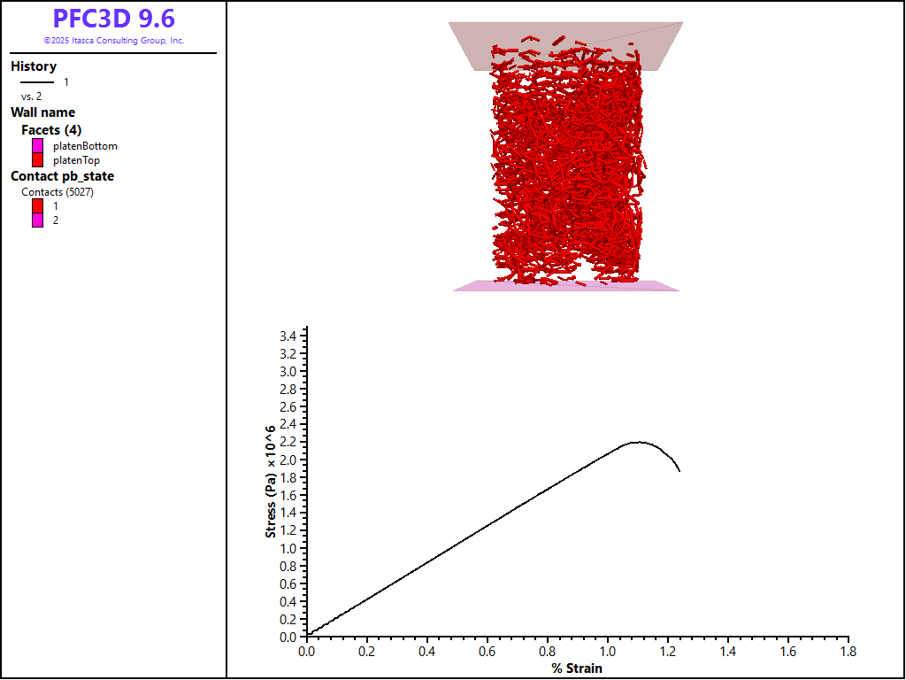 First the unconfined compression (UCS) test is performed by removing the sleeve and fixing the velocities of the platens. The results of this tests are shown in the figure below. The broken bonds are also shown to demonstrate the pervasive damage of the BPM at failure. Note that the response is quite linear to failure and that the test automatically stopped at 85% of the peak stress. This peak UCS tests of this BPM was 2.20e+06 Pa at 1.13% strain.