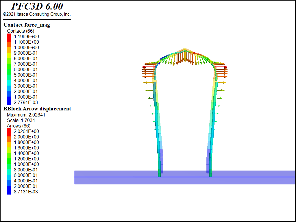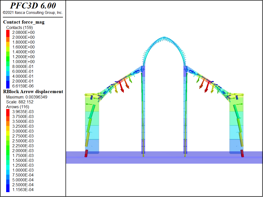 The density of the blocks is set to 2500 kg/m3. As explained above, the density of the arch is set to six times this value (15,000 kg/m3). The friction coefficient is set to 0.7. The contacts that exist between the pillars and the buttresses are bonded, though.